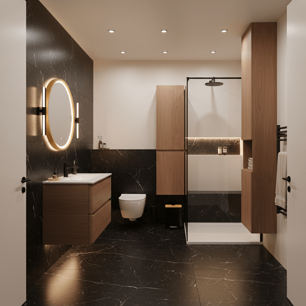 Łazienka w tej stylistyce bazuje na funkcjonalności oraz dopracowanych rozwiązaniach. Wielkoformatowe płyty gresowe o deseniu marmuru ograniczają ilość fug, co ułatwia utrzymanie czystości oraz daje harmonijny efekt wizualny. Połączenie czerni kamienia z jasnymi ścianami i drewnem pozwala modelować proporcje — przyciemnić, rozjaśnić lub podnieść optycznie sufit, czy wydzielić funkcjonalne strefy. Podwieszane szafki, zabudowy z miejscem na kosmetyki, czy wnęki wspierają organizację przestrzeni. Nowoczesna armatura i lekkie parawany walk-in podkreślają współczesny charakter, a całość pozostaje ergonomiczna na co dzień.