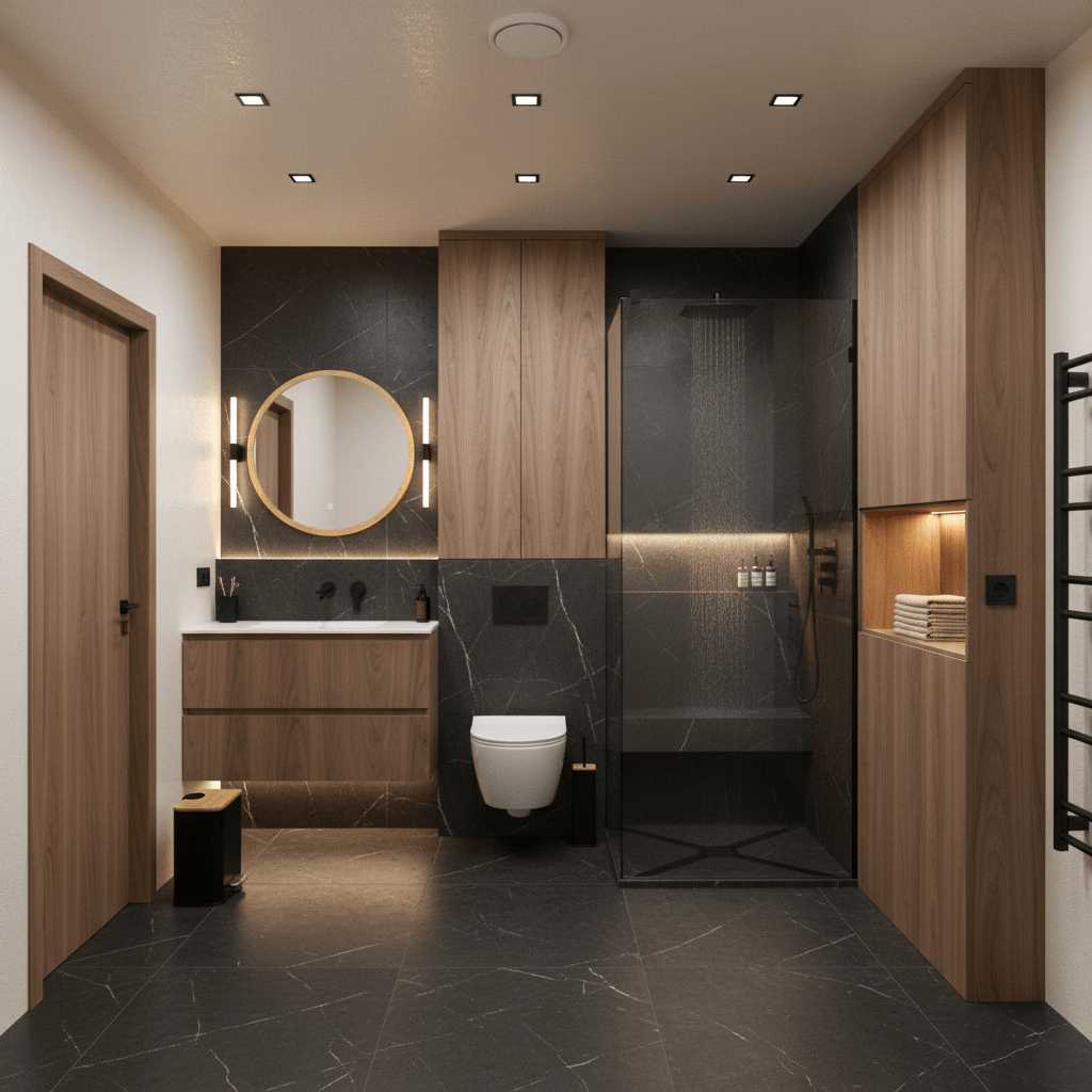 W łazience dominują wyważone proporcje czerni i drewna. Wielkoformatowy gres o wzorze Nero z subtelną żyłką układa się na podłodze i ścianach, stanowiąc jednolite tło dla stref funkcjonalnych. Ciepłe drewno równoważy szlachetny kamień i wprowadza spokojny akcent. Oświetlenie rozmieszczono tak, by równomiernie rozjaśniało płaszczyzny oraz akcentowało detale.