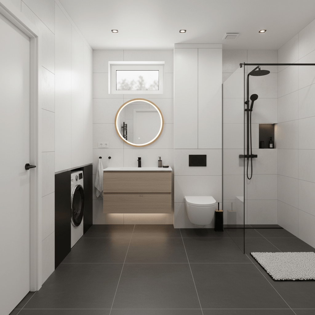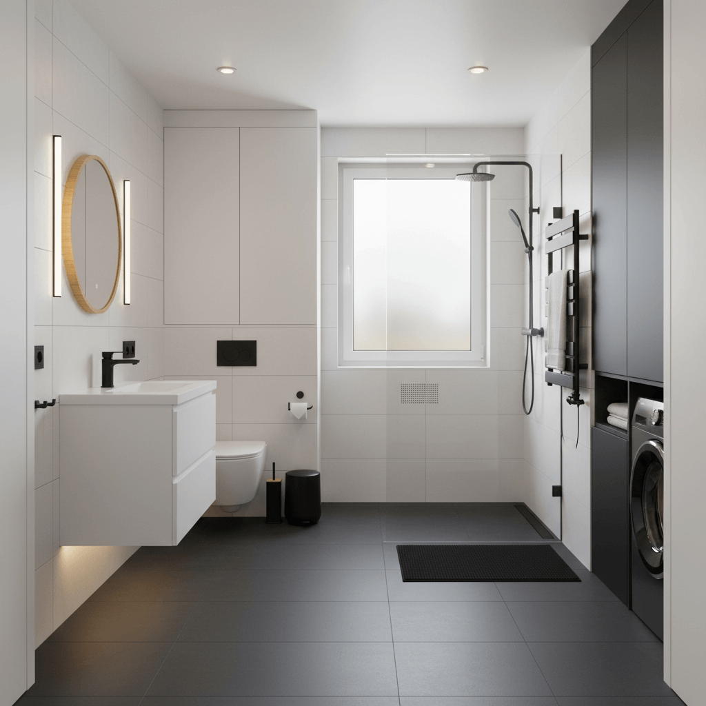 Prysznic walk-in z liniowym odpływem i deszczownicą wytycza czytelną strefę kąpielową, gwarantując komfort użycia oraz łatwość sprzątania. Podwieszane urządzenia sanitarne z podtynkową spłuczką pozostawiają podłogę praktycznie wolną, ułatwiając codzienną pielęgnację przestrzeni. Zabudowa z wnęką na pralkę oraz szafki do przechowywania zabezpieczają miejsce dla ręczników, kosmetyków i detergentów, porządkując całość układu.