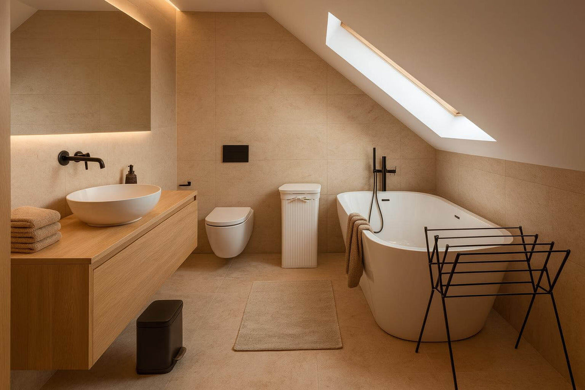 Rekomendowane są naturalne materiały, takie jak drewno i matowy gres, w jasnej, neutralnej kolorystyce: beżowej, kremowej i piaskowej. Takie połączenie ociepla wnętrze i podkreśla subtelny charakter łazienki na poddaszu.