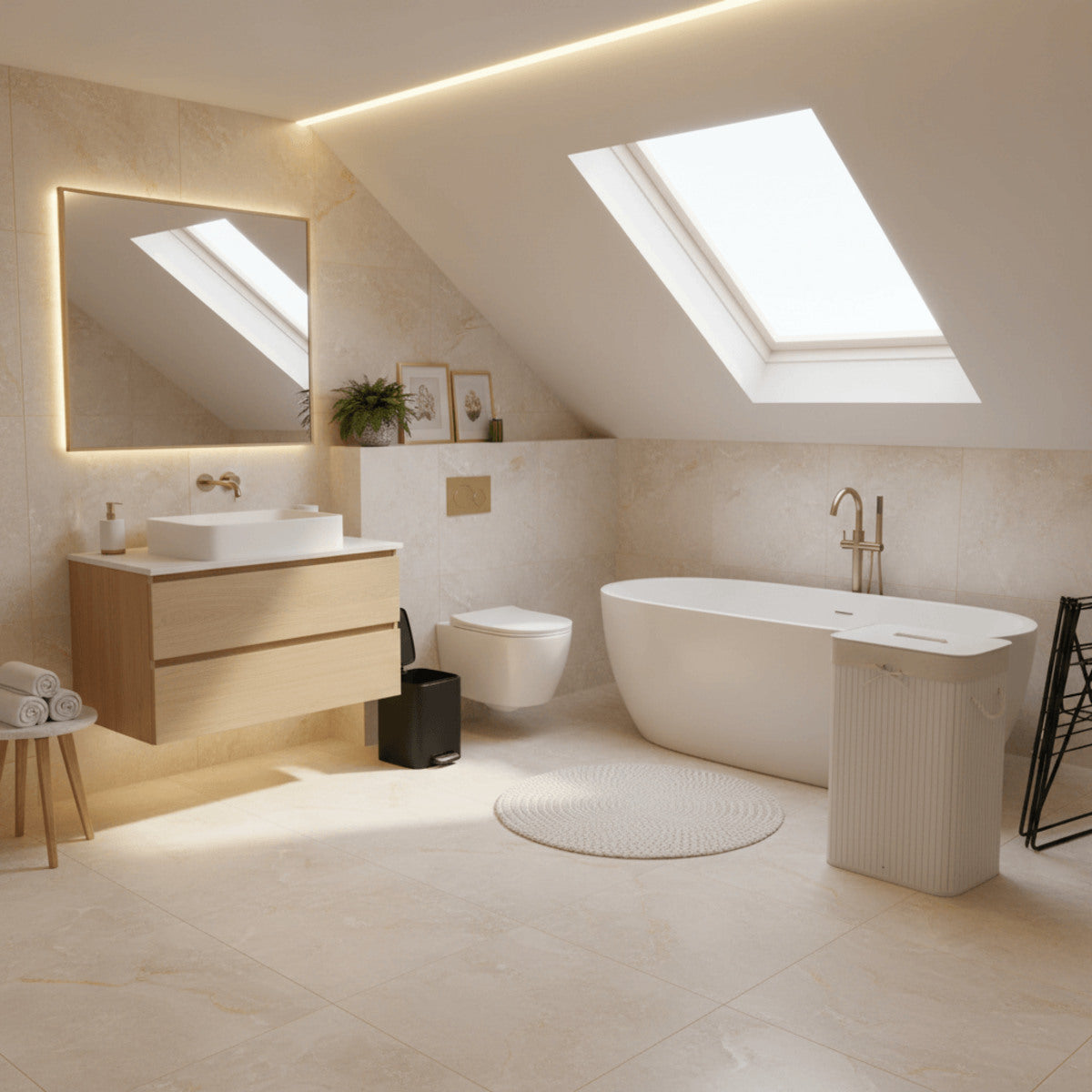 We wnęce pod skosem, nad wanną wolnostojącą, znajduje się strefa powiększająca optycznie wnętrze. Praktyczny schowek pod umywalką oraz lekki stelaż na ręczniki ułatwiają organizację przechowywania i utrzymanie porządku. Rozproszone światło LED oraz umiejscowione centralnie lustro intensyfikują efekt przestronności poprzez odbijanie światła wpadającego przez okno dachowe. Dodatki, takie jak dywanik, ręczniki i ceramiczne akcesoria, dopełniają aranżację, zachowując równowagę pomiędzy estetyką a codzienną wygodą użytkowania.