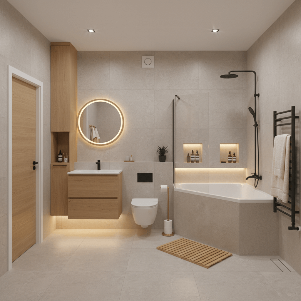 Narożna wanna jest uzupełniona lekkim parawanem i deszczownicą, co sprzyja wydzieleniu strefy kąpielowej bez wizualnego przeładowania. Odpływ liniowy porządkuje podział posadzki. Punktowe oświetlenie sufitowe oraz światło obwodowe przy lustrze podnoszą komfort użytkowania. Drewniane i czarne akcenty – jak grzejnik, kratka pod stopy czy niska roślina – wprowadzają równowagę i spójność. Centralne, podświetlane lustro dopełnia aranżację strefy umywalki, a zestawienie różnych faktur wspiera nowoczesny, funkcjonalny minimalizm.