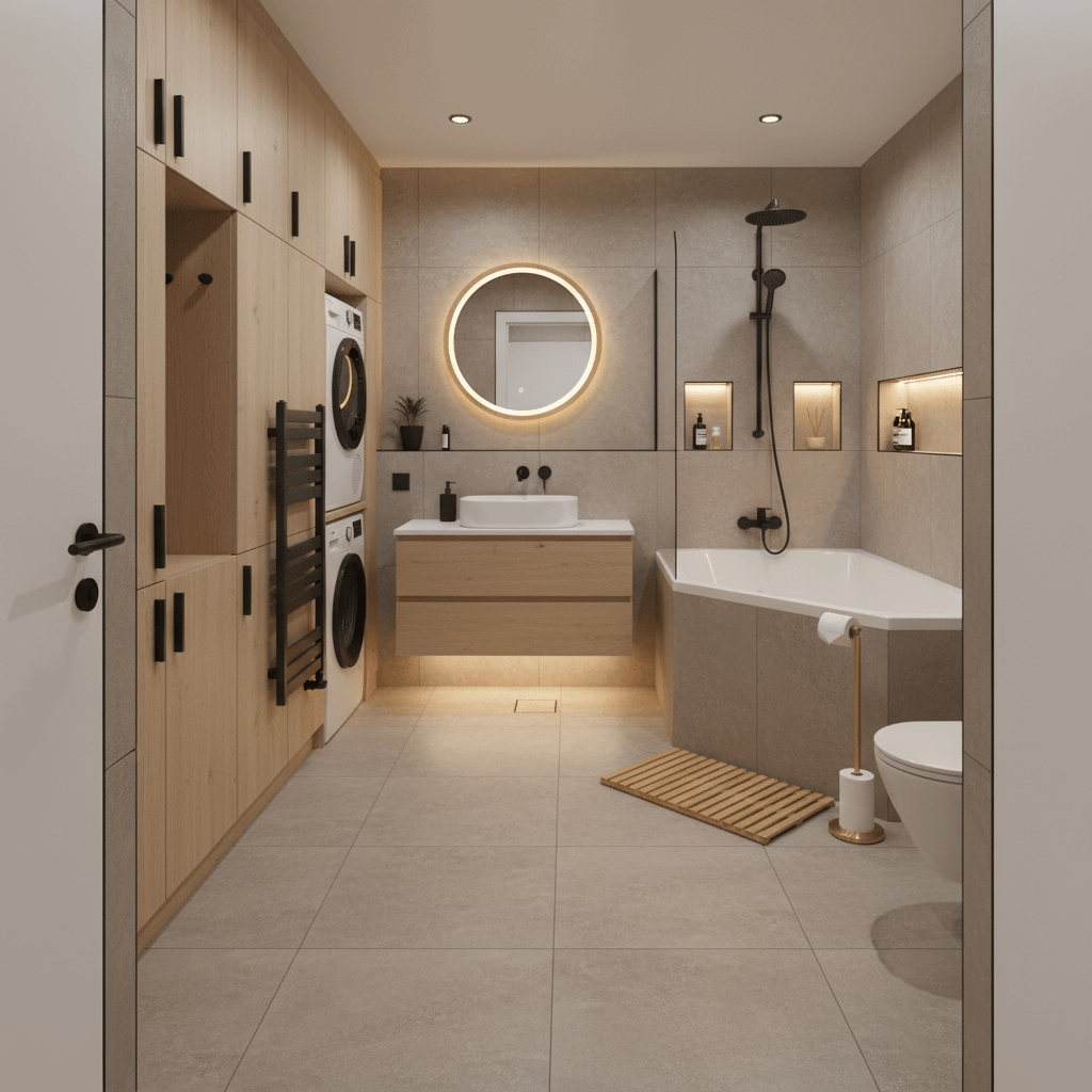 Nowoczesna przestrzeń z narożną wanną stawia na estetykę połączoną z praktycznością. Sanitarne elementy rozmieszczone w narożnikach zwiększają dostępność powierzchni i umożliwiają swobodę ruchu. Wielkoformatowe płytki w stonowanych barwach dodatkowo optycznie powiększają wnętrze, a spójne fugi akcentują minimalistyczny styl. Podwieszane szafki oraz zabudowa z miejscem na pralkę czy suszarkę pomagają zachować porządek i klarowność kompozycji. Oświetlenie – od górnych opraw po LED-y przy lustrze i w niszach – sprawia, że łatwo stworzyć odpowiedni nastrój na każdą porę dnia oraz czynności rutynowe.