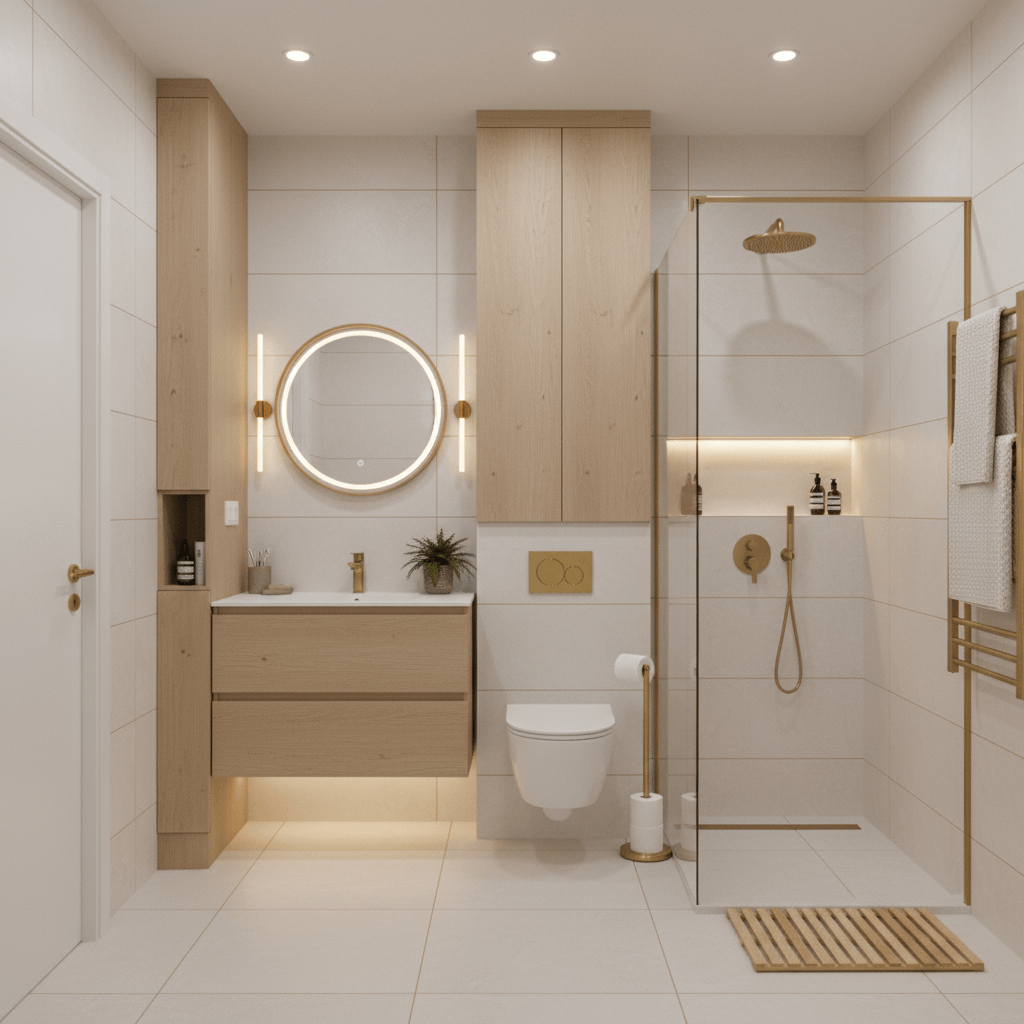 Łazienka ze złotymi dodatkami to propozycja dla osób, które cenią wyważoną elegancję oraz subtelny efekt luksusu już od pierwszego spojrzenia. Przestrzeń utrzymana jest w neutralnych beżach, kremach i odcieniach ciepłego drewna, gdzie złote elementy pojawiają się dzięki przemyślanej kompozycji. Akcenty wykończone na wysoki połysk przypominają biżuterię dodaną do klarownego, harmonijnego tła. Układ wnętrza sprzyja płynności codziennych czynności, materiały wykazują wysoką trwałość i łatwość utrzymania czystości, a światło buduje warstwową strukturę przestrzeni.