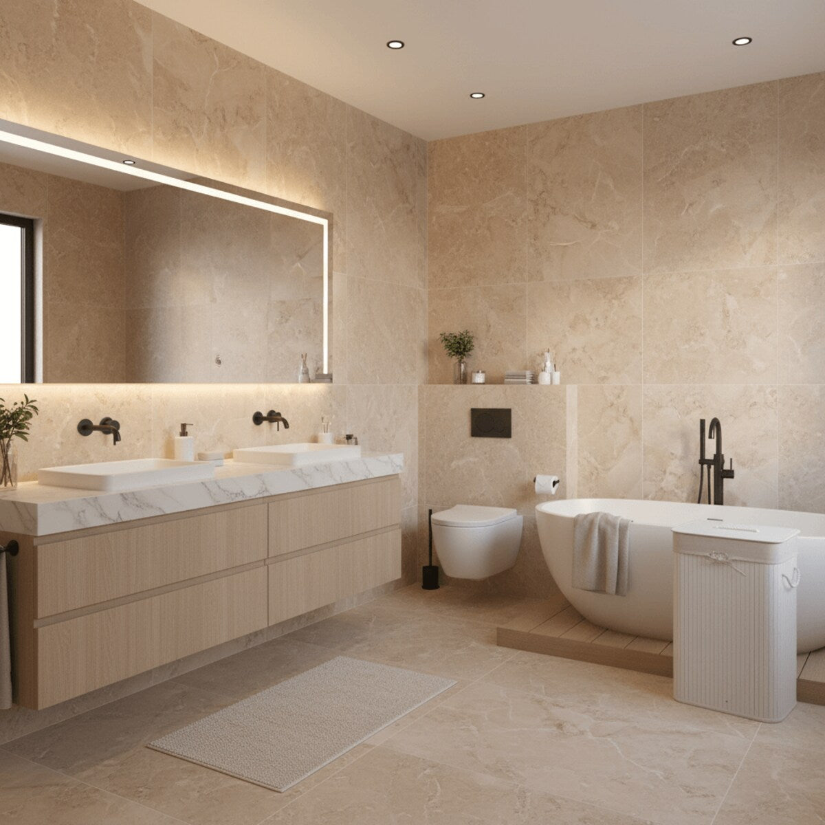 W tej aranżacji zastosowano jasny kamień oraz wykończenia z ciepłego drewna, zestawione z beżowymi płytkami gresowymi na ścianach i podłodze. Subtelne oświetlenie z wbudowanych reflektorów i podświetlanego LED lustra podkreśla spokojny rytm przestrzeni. Centralne miejsce zajmuje wolnostojąca wanna na platformie z ryflowanego drewna, tworząc silnie zaznaczony punkt strefy kąpielowej.