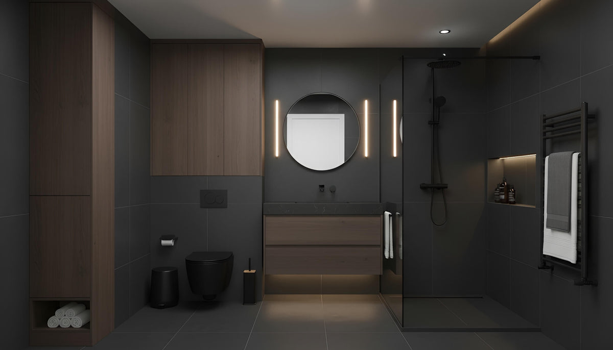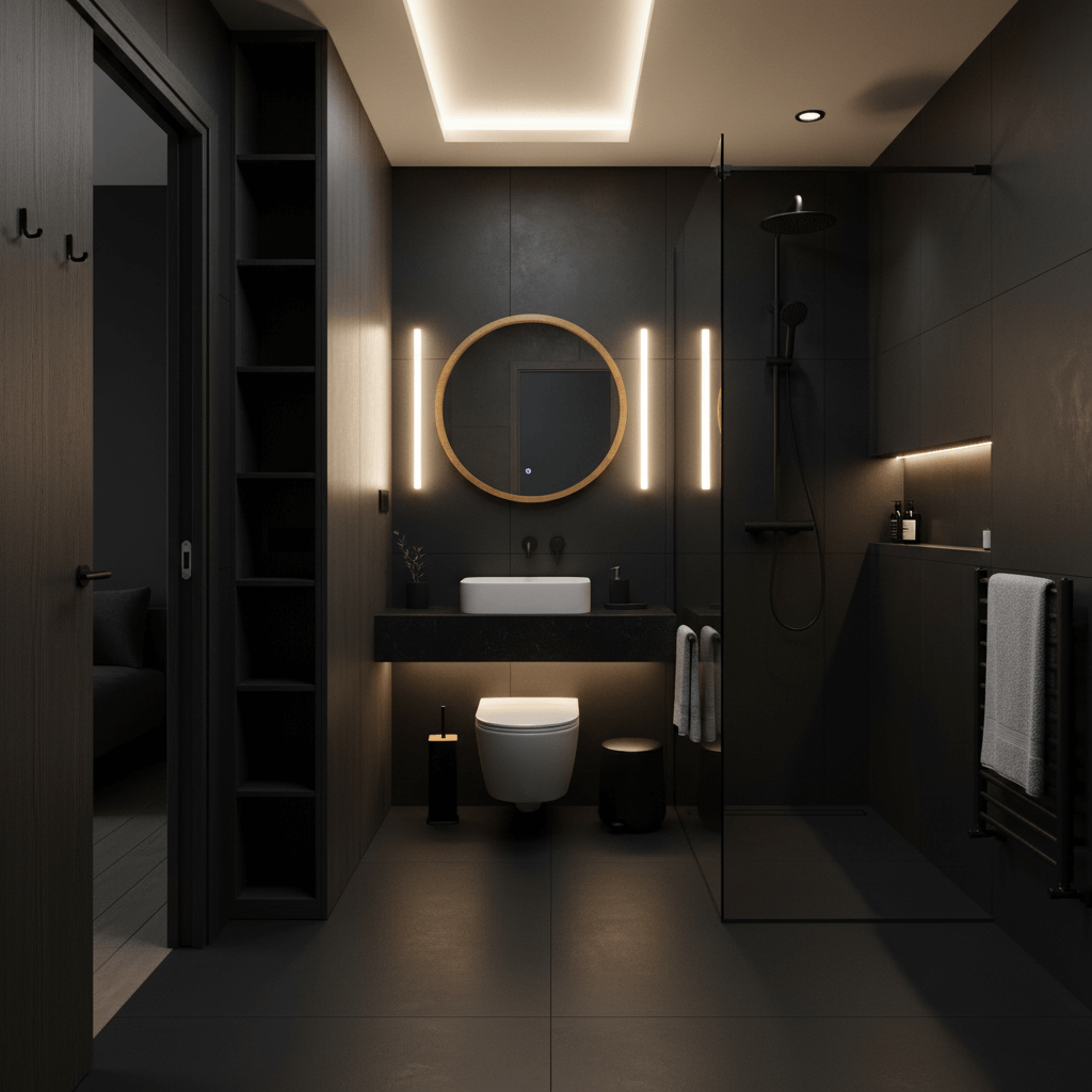 Mimo odważnego charakteru, ciemna łazienka zachowuje pełną ergonomię. Dominują wielkoformatowe płytki w kolorze grafitu oraz antracytu. Minimalizacja fug optycznie porządkuje przestrzeń, a matowe wykończenia są przyjemne i praktyczne na co dzień. Drewno – orzech, dąb lub fornir – wprowadza wizualne ocieplenie i kontrast. Schowki, podwieszane szafki i przestronna strefa prysznica walk-in z dyskretnym parawanem zwiększają użyteczność. LED-owe światło pozwala z łatwością zmieniać klimat wnętrza.