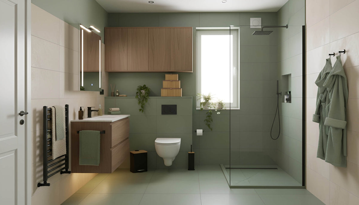 Ta aranżacja wykorzystuje łagodne światło poranka oraz delikatny półcień, który podkreśla gładkie powierzchnie. Zgaszona zieleń współgra z piaskowym beżem, tworząc tło dla ciepłych fornirów i czarnej armatury. Wyraźnie zarysowane linie nadają aranżacji klarowności, a matowa glazura i wielkoformatowy gres wzmacniają monolityczny efekt przestrzeni. Walk-in z dyskretnym parawanem i liniowym odpływem zapewnia wygodne użytkowanie. Wbudowane półki i szafki porządkują przedmioty, a grzejnik stanowi dopracowany element wnętrza. Lustrzane panele LED oraz kinkiety odpowiadają za odpowiednie doświetlenie. Rośliny wprowadzają optyczne przełamanie minimalistycznej kompozycji. Całość skierowana jest do zwolenników wyrazistych układów i surowych materiałów.