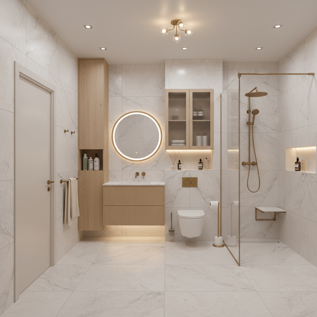 Funkcjonalność tej luksusowej aranżacji opiera się na odpowiednich proporcjach, ergonomii oraz prostocie pielęgnacji. Wielkoformatowe gresowe płyty imitujące marmur ograniczają liczbę fug i wizualnie powiększają przestrzeń, jednocześnie ułatwiając utrzymanie czystości. Podwieszane szafki oraz zabudowy słupkowe zapewniają zorganizowany układ przechowywania, eksponując jedynie wyselekcjonowane dodatki. Armatura o szczotkowanym, złotym wykończeniu gwarantuje trwałość oraz odporność na ślady codziennego użytkowania. Oświetlenie w formie sufitowych oczek, liniowych LED przy podłodze oraz podświetlanego lustra zapewnia funkcjonalne światło dostosowane do różnych potrzeb łazienki. Bezprogowy prysznic, podwieszana misa WC i szklane przeszklenia wpływają na lekkość wnętrza i łatwość utrzymania porządku.