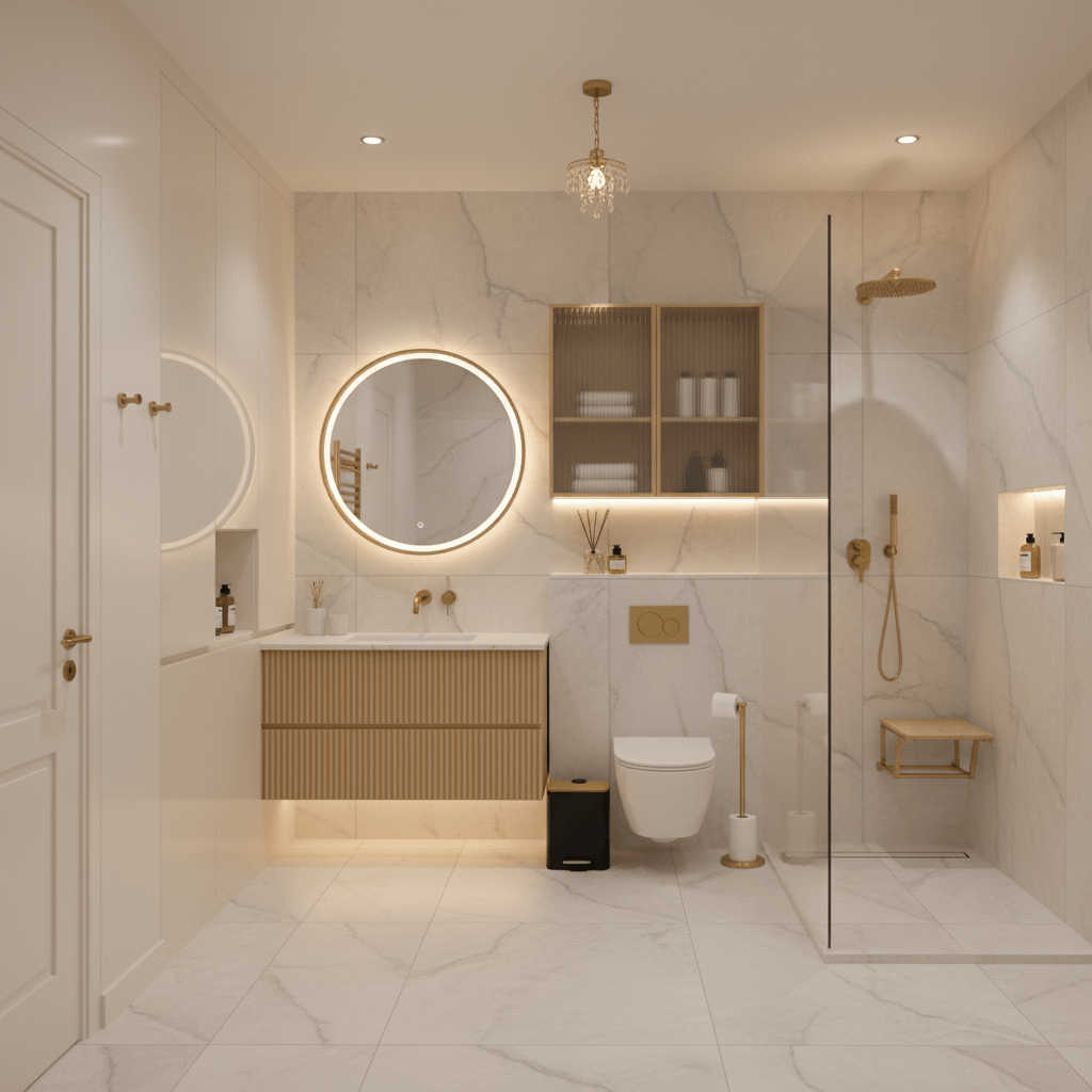 W aranżacji każdy detal współtworzy spójną całość, podkreślając charakter łazienki glamour. Pionowe frezowania mebli, ryflowane szkło oraz światło przechodzące przez marmurowe powierzchnie wzbogacają stylistykę wnętrza. Projekt łączy równowagę między elegancją a klimatem spa. Aranżacje łazienek glamour złota mogą różnić się detalami – od minimalistycznych po cieplejsze, przytulne kompozycje – jednak bazowa paleta jasnych barw, naturalnych materiałów i złotych akcentów pozostaje niezmienna. Zmienność układów i proporcji światła sprawia, że każda realizacja zachowuje swoją harmonijną, elegancką aurę.