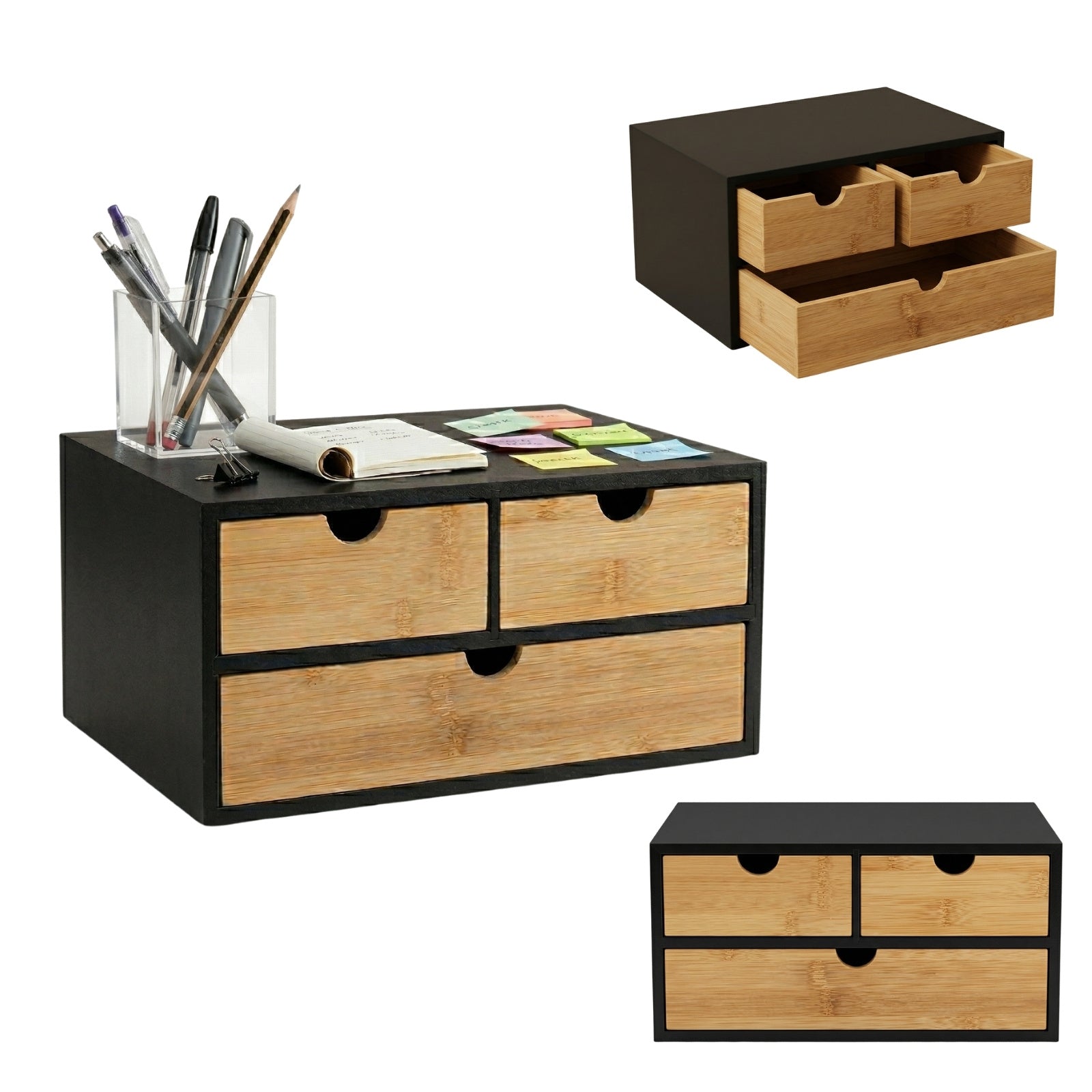 - Nowoczesny design: Matowe wykończenie czarnej obudowy w połączeniu z naturalnym kolorem bambusa tworzy elegancki i nowoczesny wygląd. Organizer doskonale wpasuje się w różnorodne aranżacje wnętrz, dodając im charakteru.