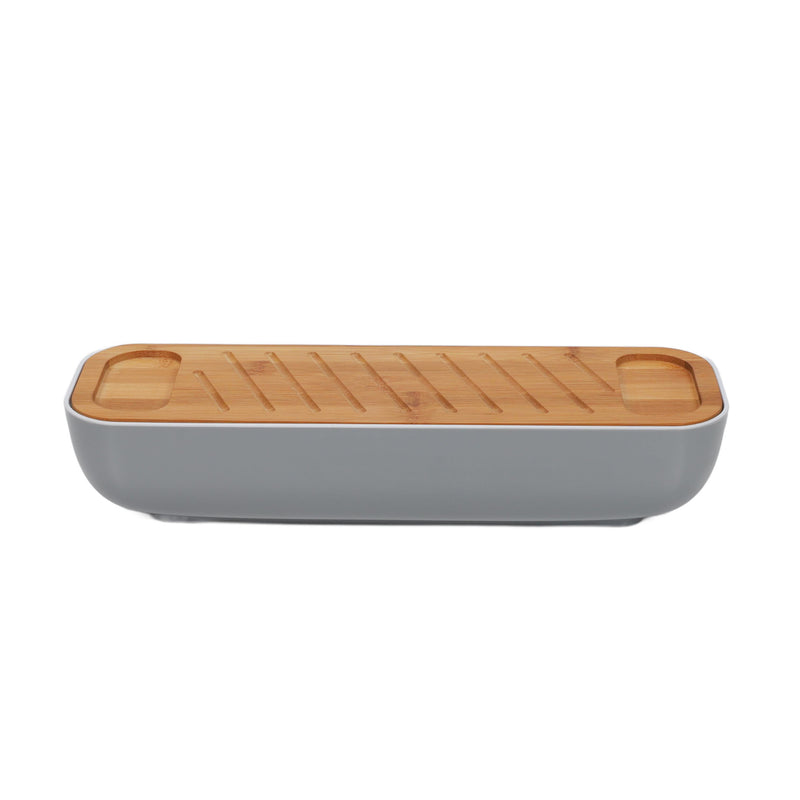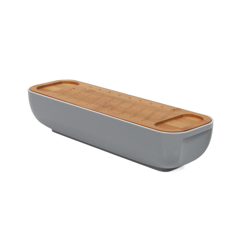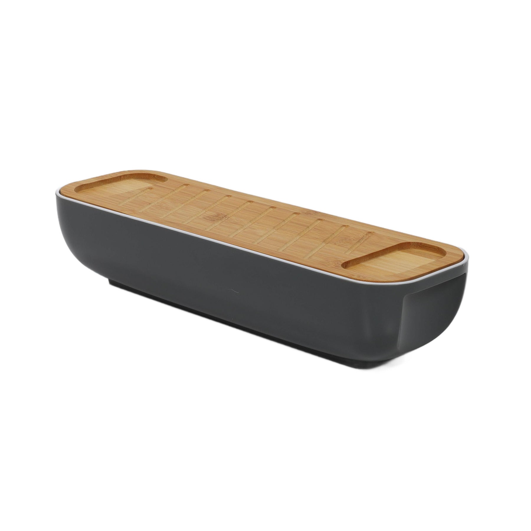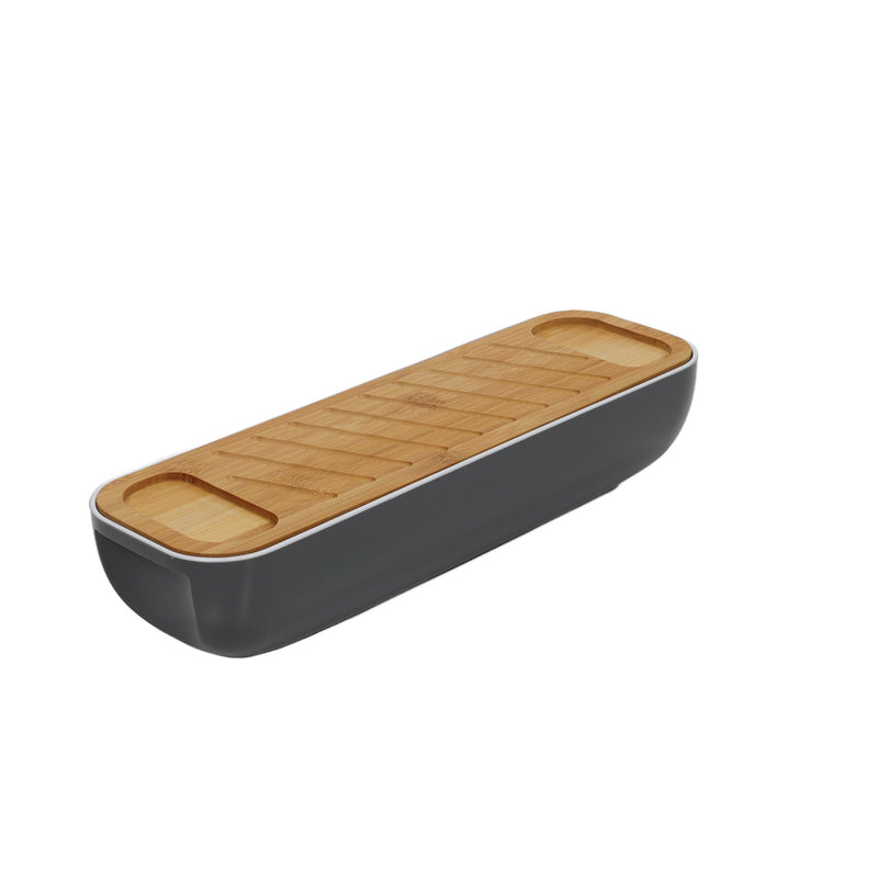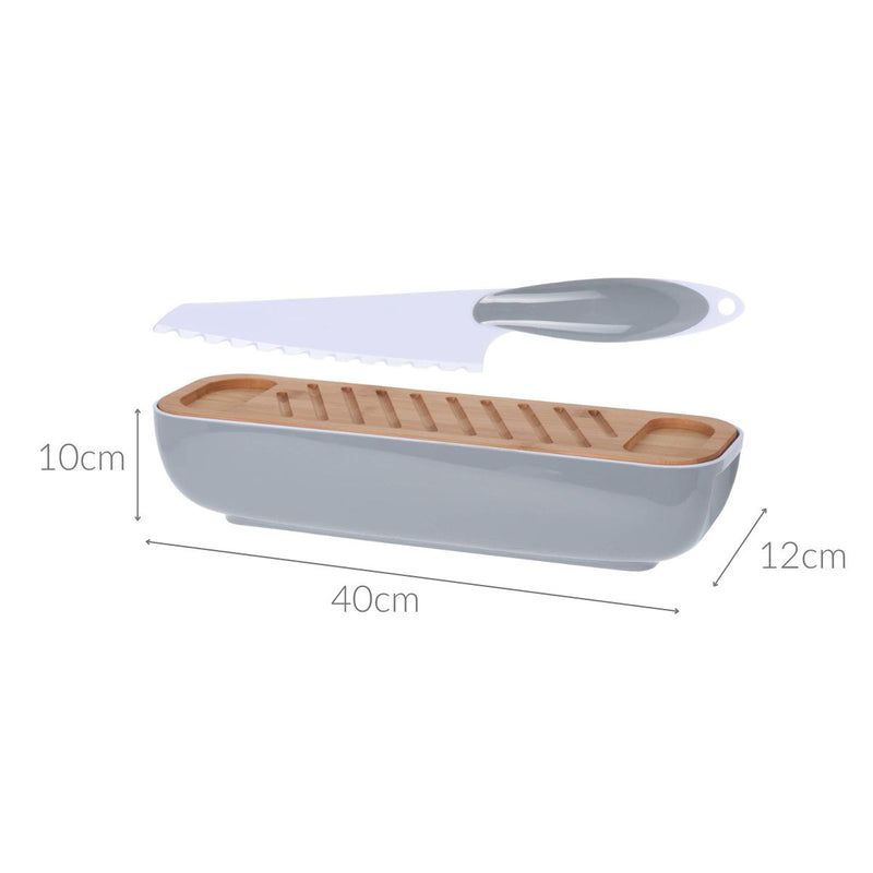 Chlebak ma wymiary 40 x 12 x 10 cm (długość x szerokość x wysokość) i bez trudupomieści większość ulubionych wypieków. Szczególnie dobrze sprawdzi się do przechowywania francuskich bułek i bagietek, ale także poradzi sobie z chrupiącym pieczywem pełnoziarnistym czy słodką chałką. Wysokiej jakości tworzywo sztuczne skutecznie chroni znajdujące się wewnątrz pieczywo, a ponadto jestłatwe w utrzymaniu czystościi odporne na zarysowania. Zdejmowana pokrywka z drewna bambusowego charakteryzuje się większą wytrzymałością niż zwykłe drewno. Dołączony do kompletu nóż posiada specjalne ząbki ułatwiający krojenia wypieków.