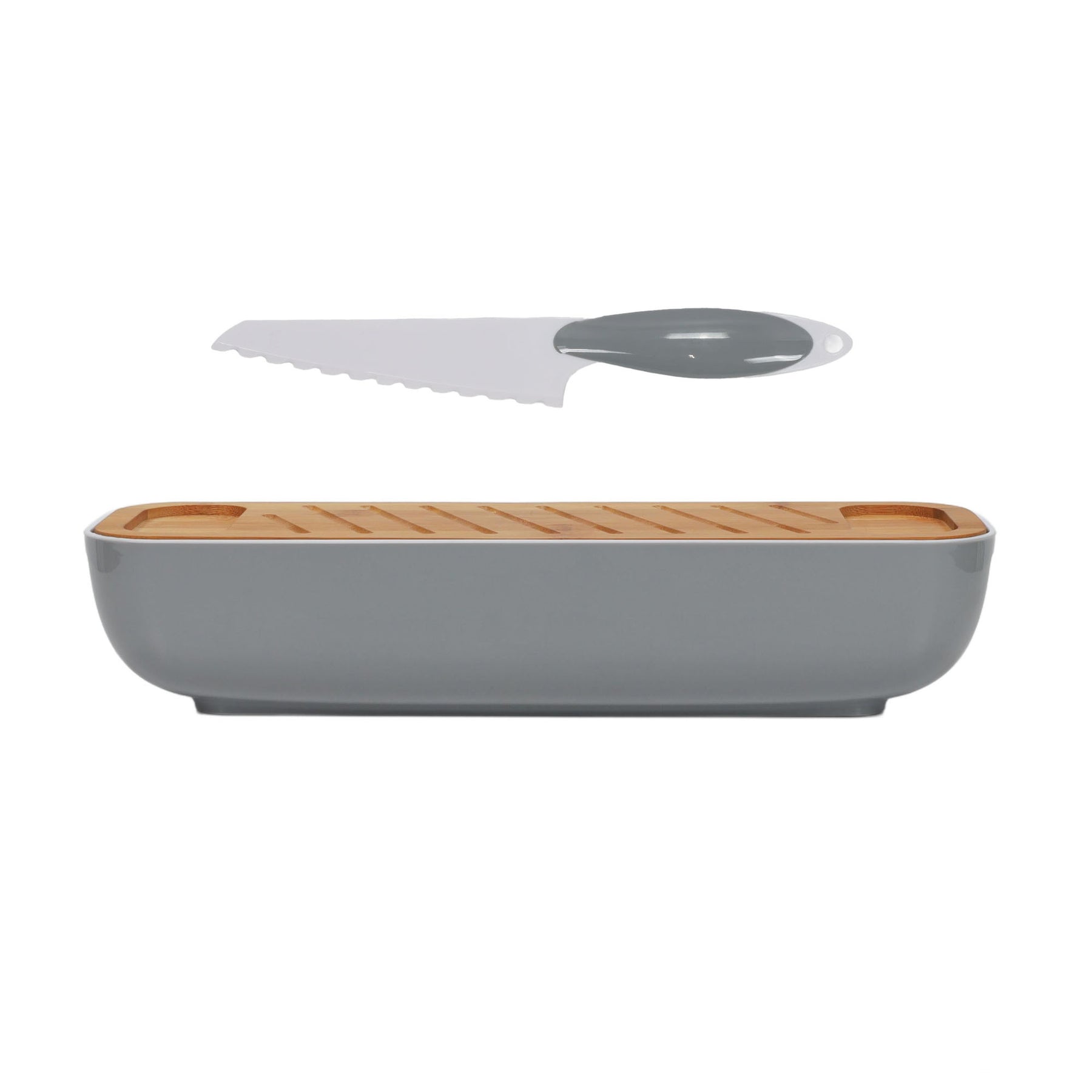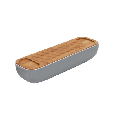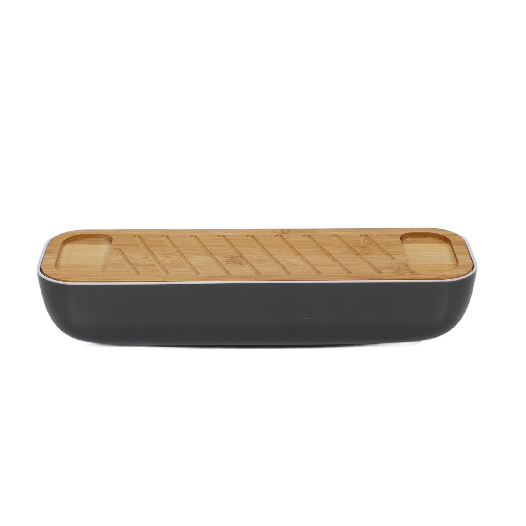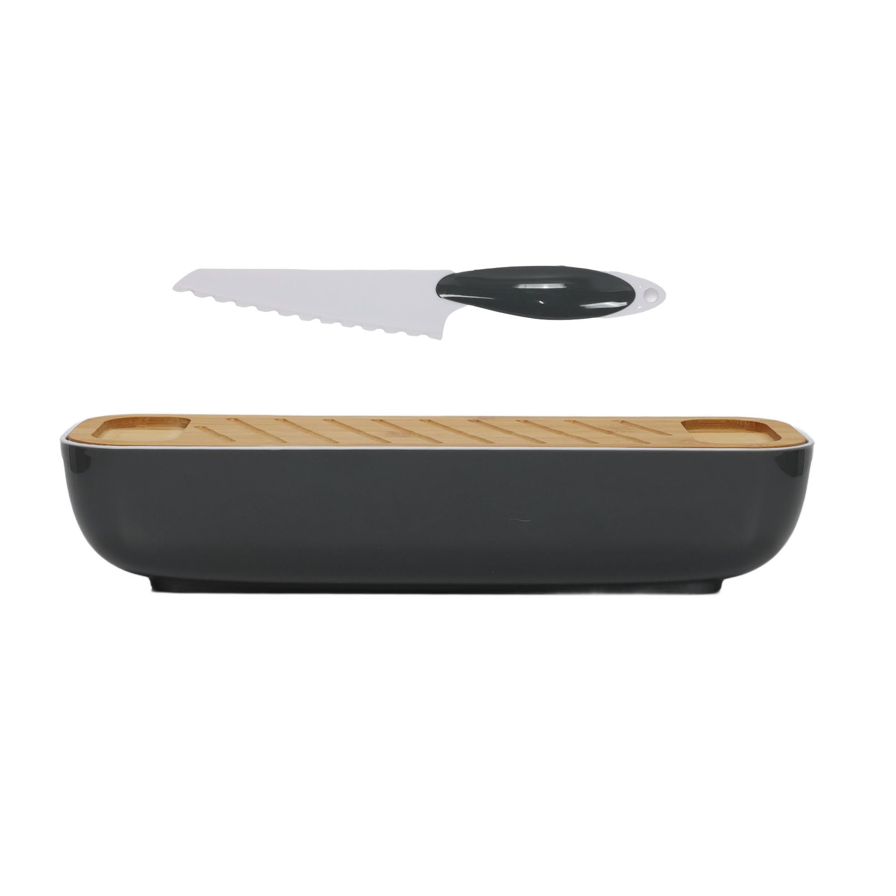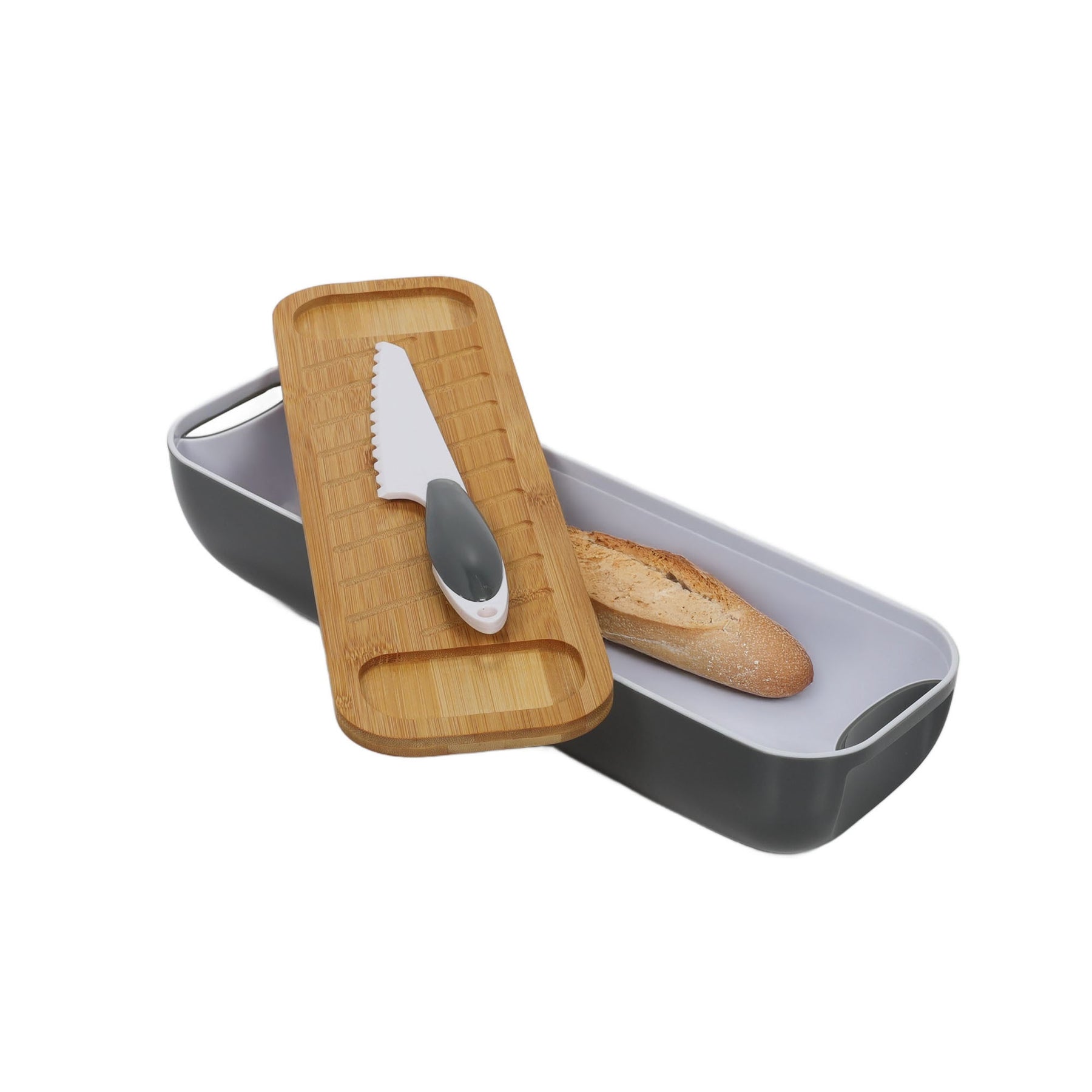 Chlebak z drewnianą pokrywką, w zestawie z nożem to propozycja od holenderskiej marki Excellent Houseware. Przymyślany projekt sprawia, że produkt łączy w sobie 3 funkcje, a przy tym doskonale prezentuje się na blacie kuchennym. Podłużny kształt pozwala na wygodne przechowywanie bagietek, bułek lub rogalików i bez problemu zmieści się na każdej szafce kuchennej.
