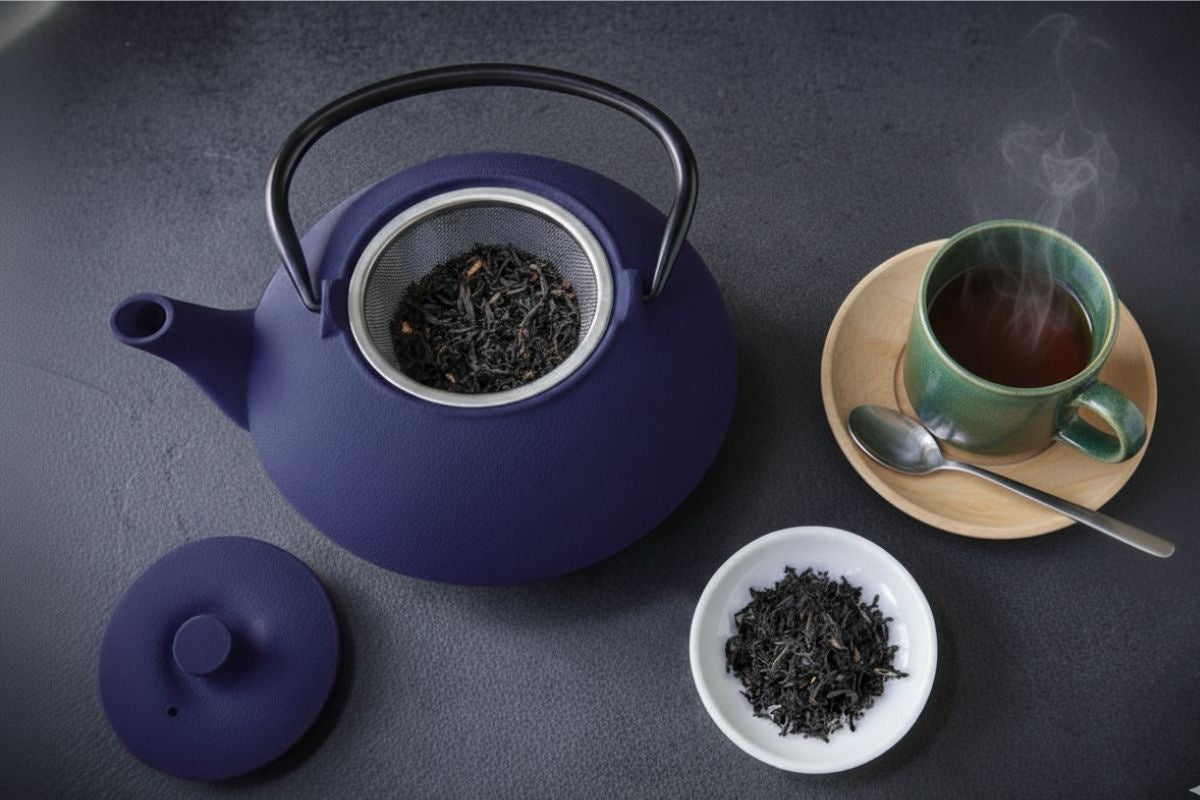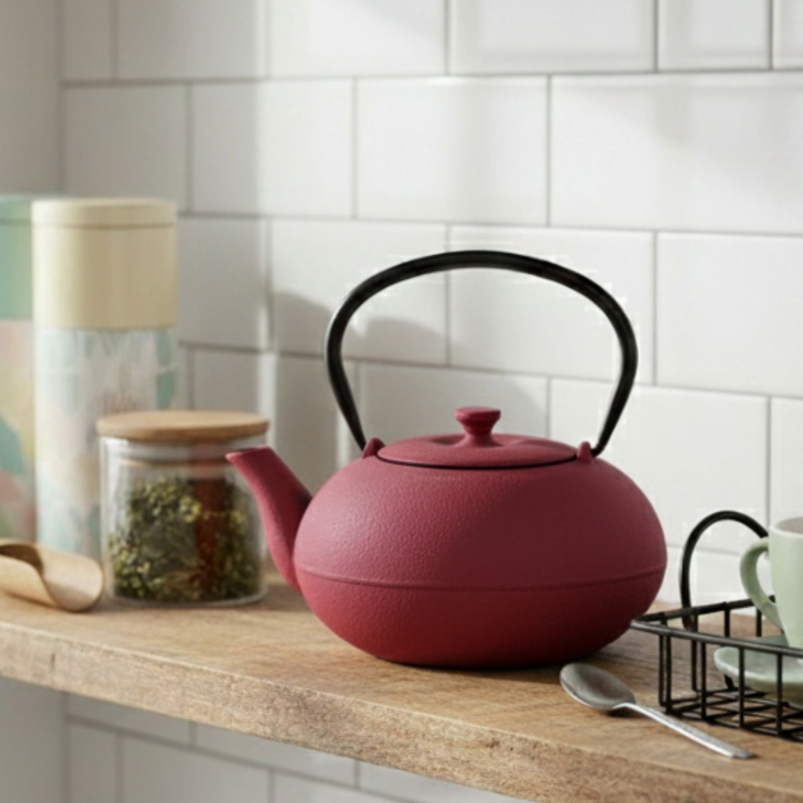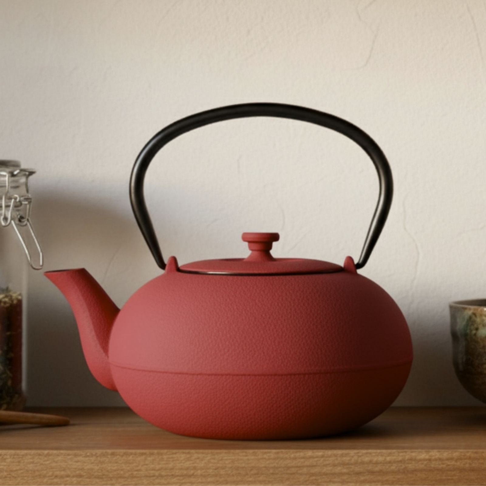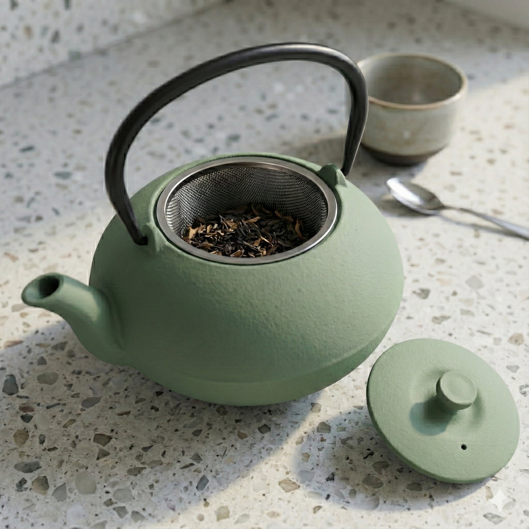 - Żeliwna obudowa + pokrywka: Masywne żeliwo pomaga dłużej utrzymać temperaturę herbaty podczas parzenia i serwowania.