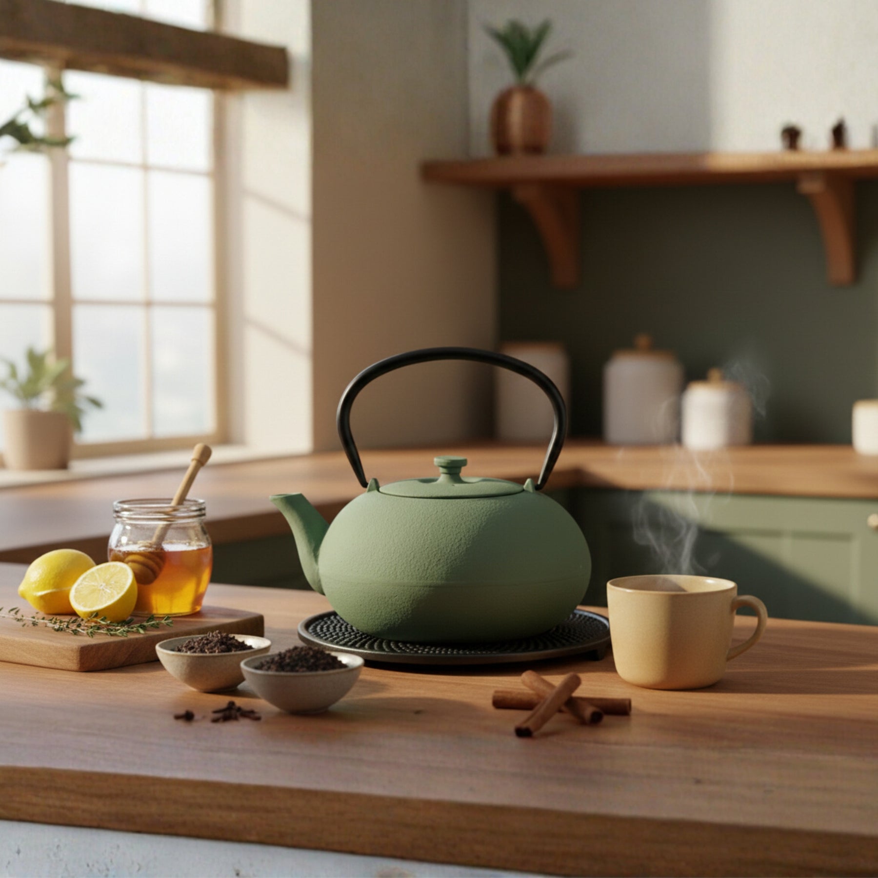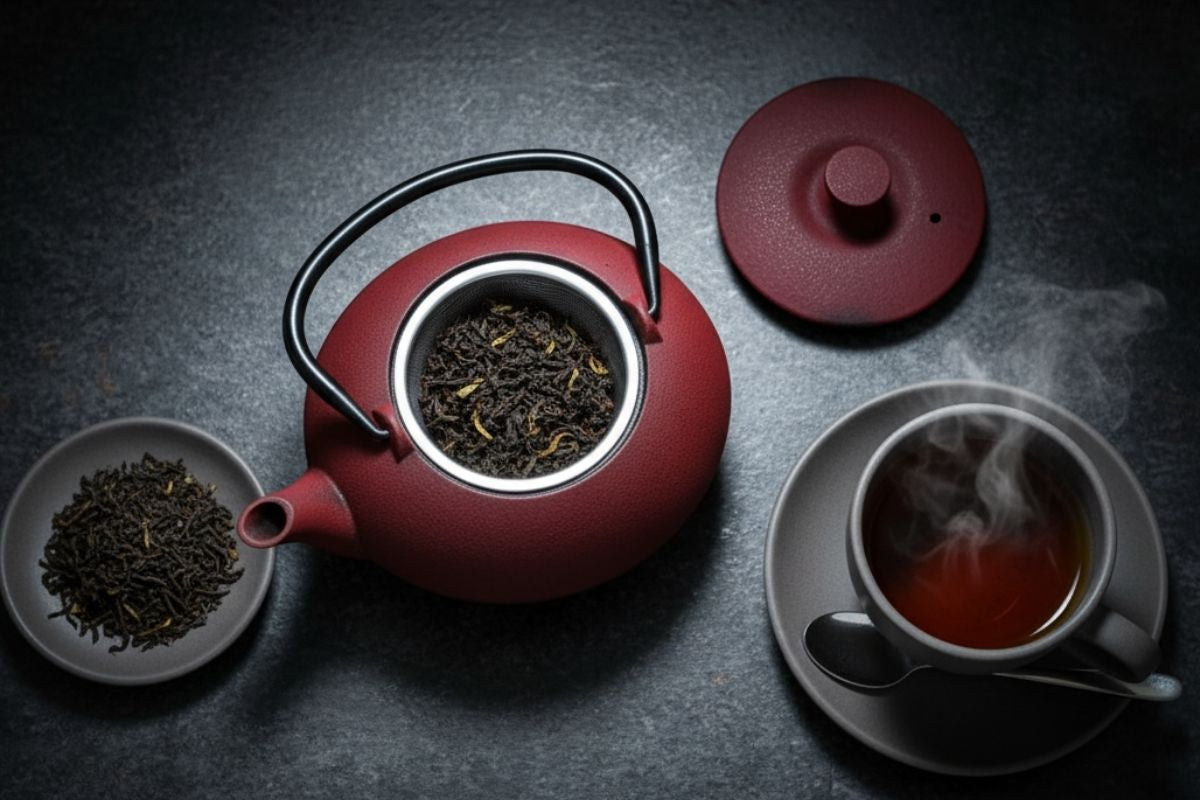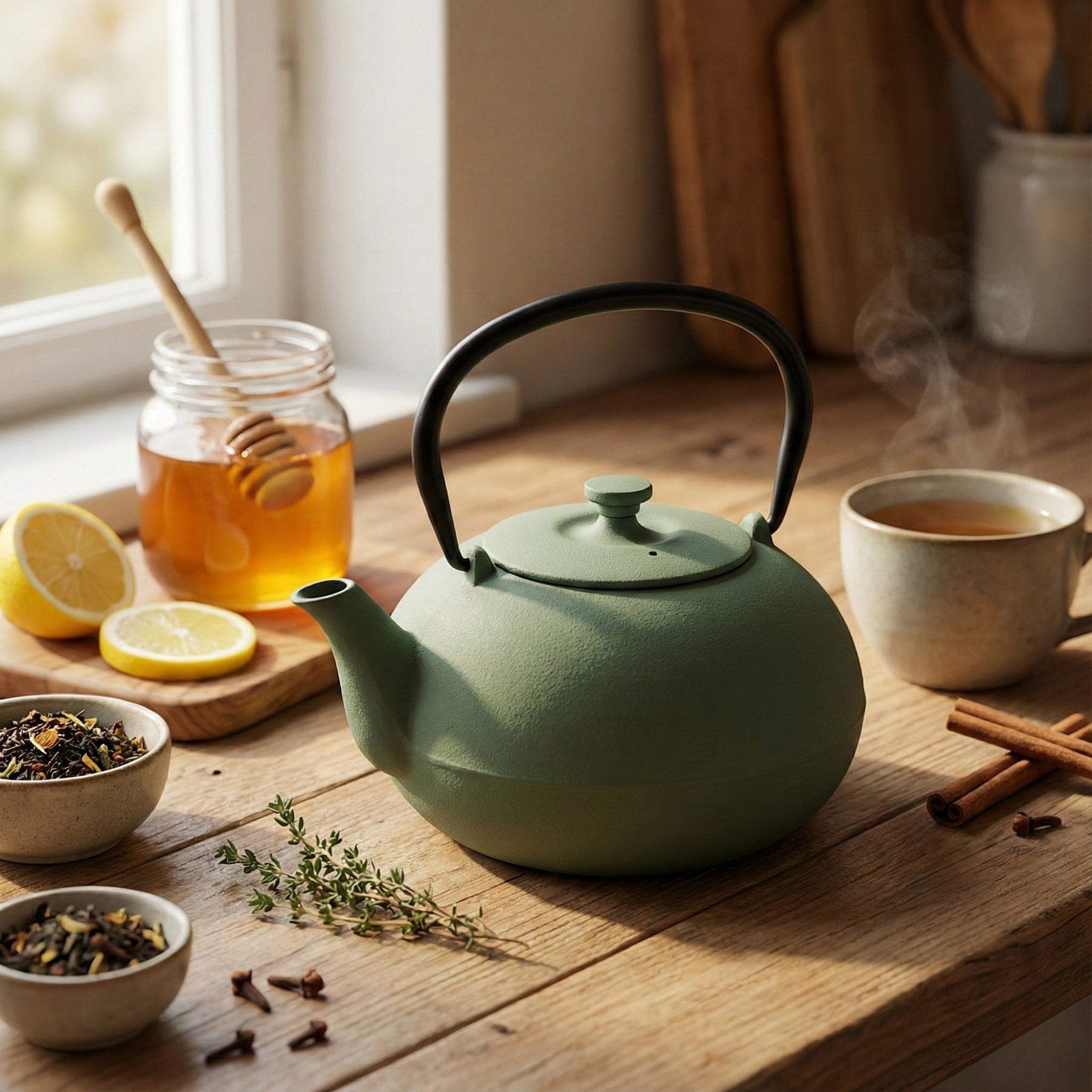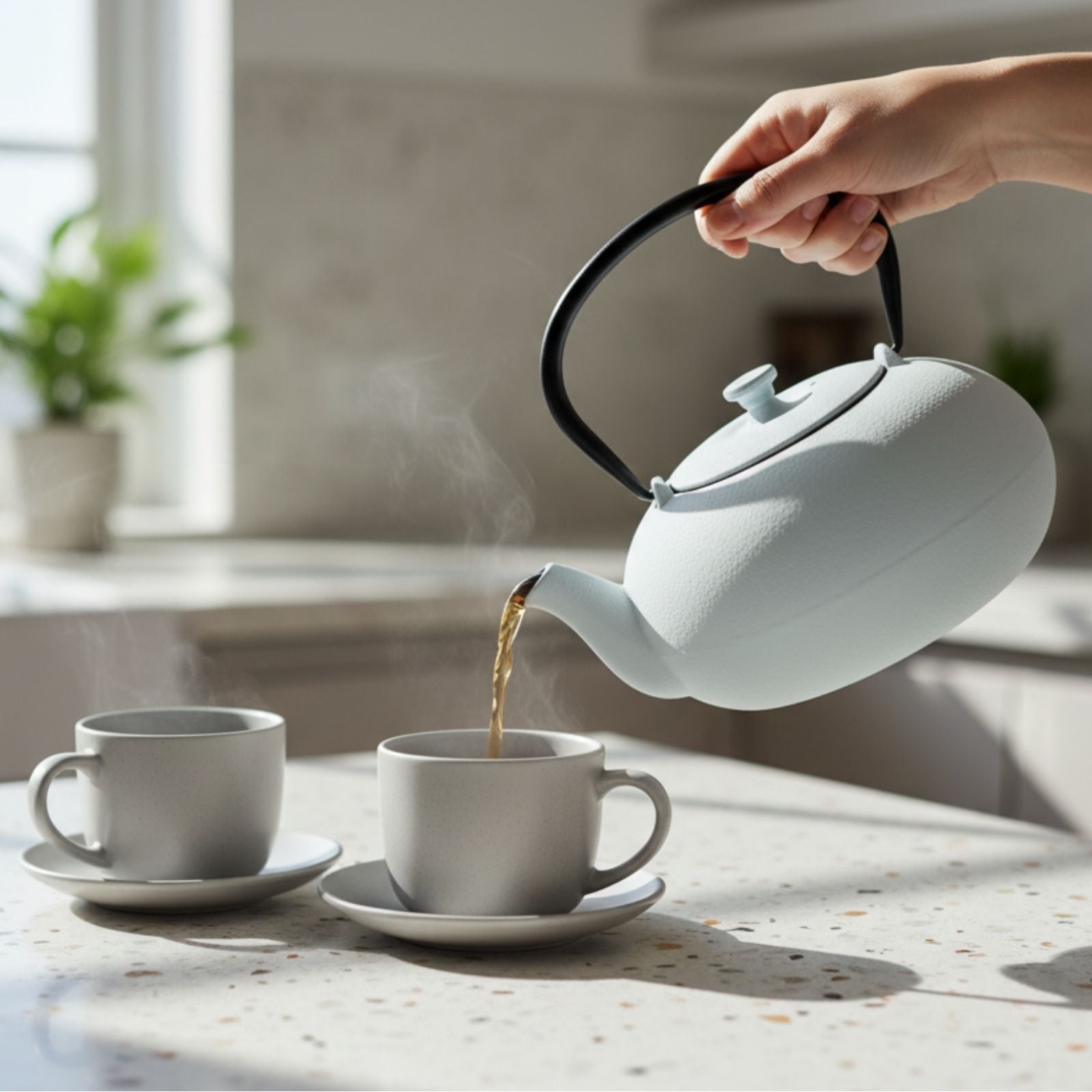 - Żeliwna obudowa + pokrywka: Masywne żeliwo pomaga dłużej utrzymać temperaturę herbaty podczas parzenia i serwowania.