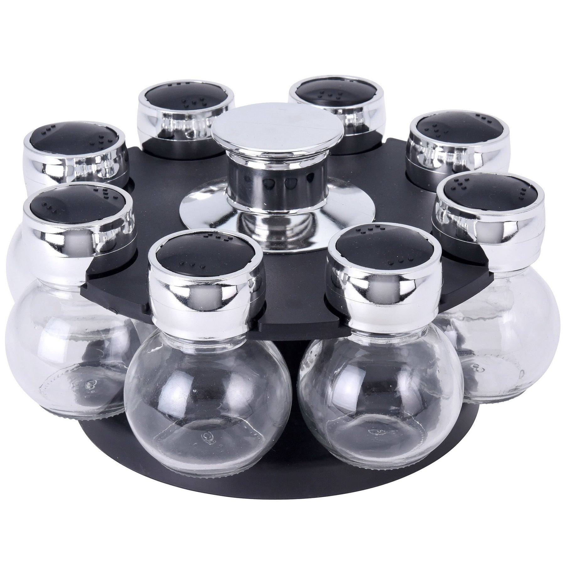 Stojak na przyprawy jest obrotowy, dzięki czemu możemy jednym ruchem ręki okręcić przyprawy, aby były tuż pod ręką. Szklane pojemniki na przyprawy są także najbardziej praktyczne, bo nie wpływają na smak, ani zapach zawartości, a także są najbardziej higienicznym rozwiązaniem dla celów kuchennych.