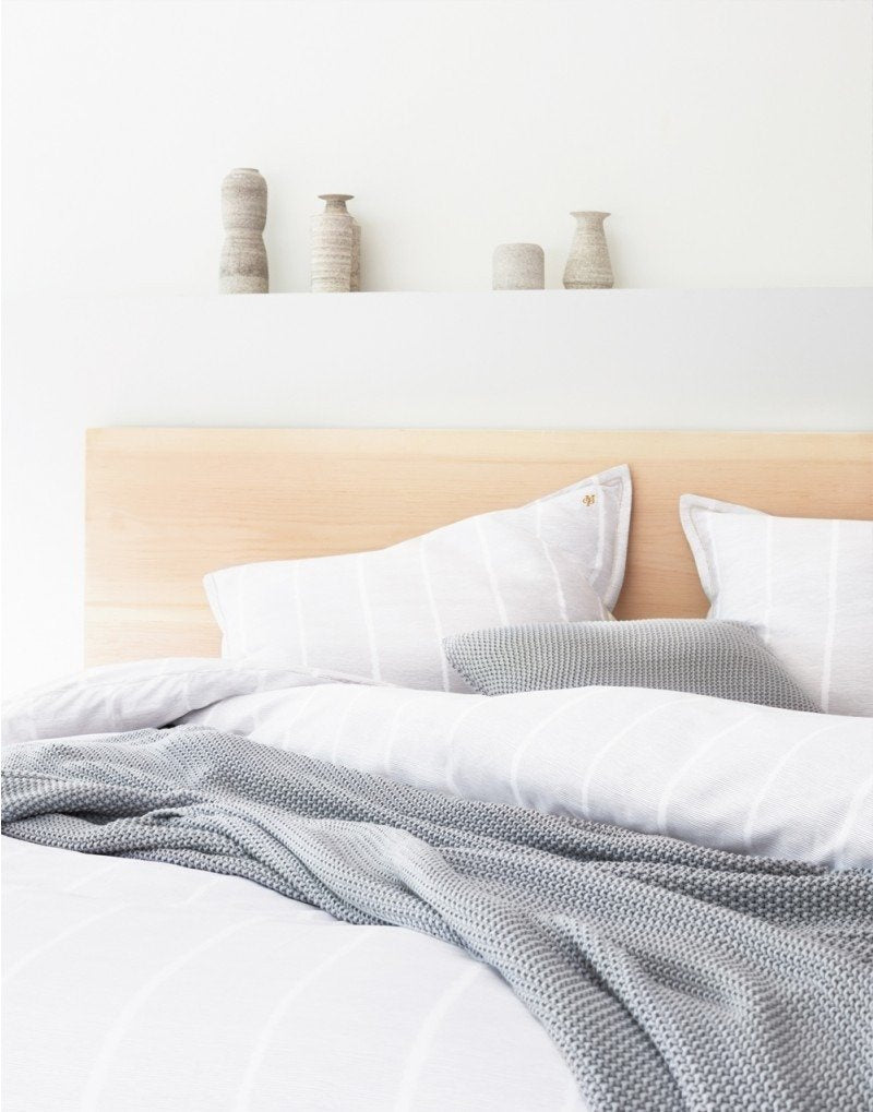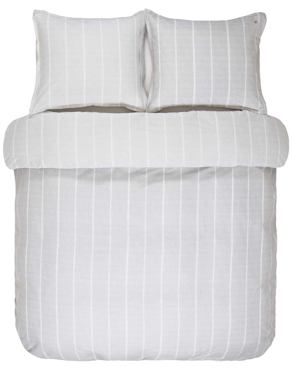 Elegancką poszwę na kołdrę pokrywa subtelny deseń z cienkich pasków, umieszczonych na tle uniwersalnej i stonowanej barwy, pasującej do niemal każdego wnętrza, zwłaszcza przeznaczonego na chwile relaksu. Złota nić szwów oraz haftowanego minimalistycznego logo stanowią istotny dla charakteru kolekcji wyrafinowany i szykowny detal.