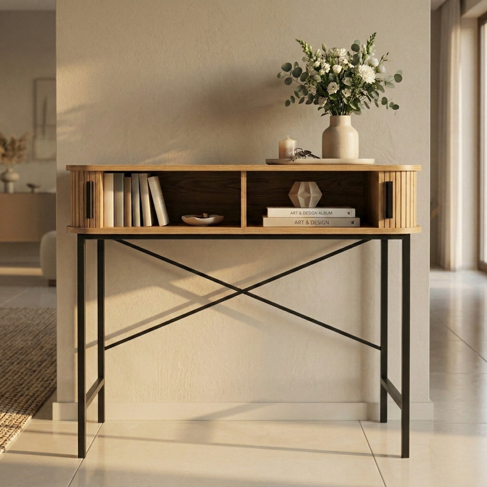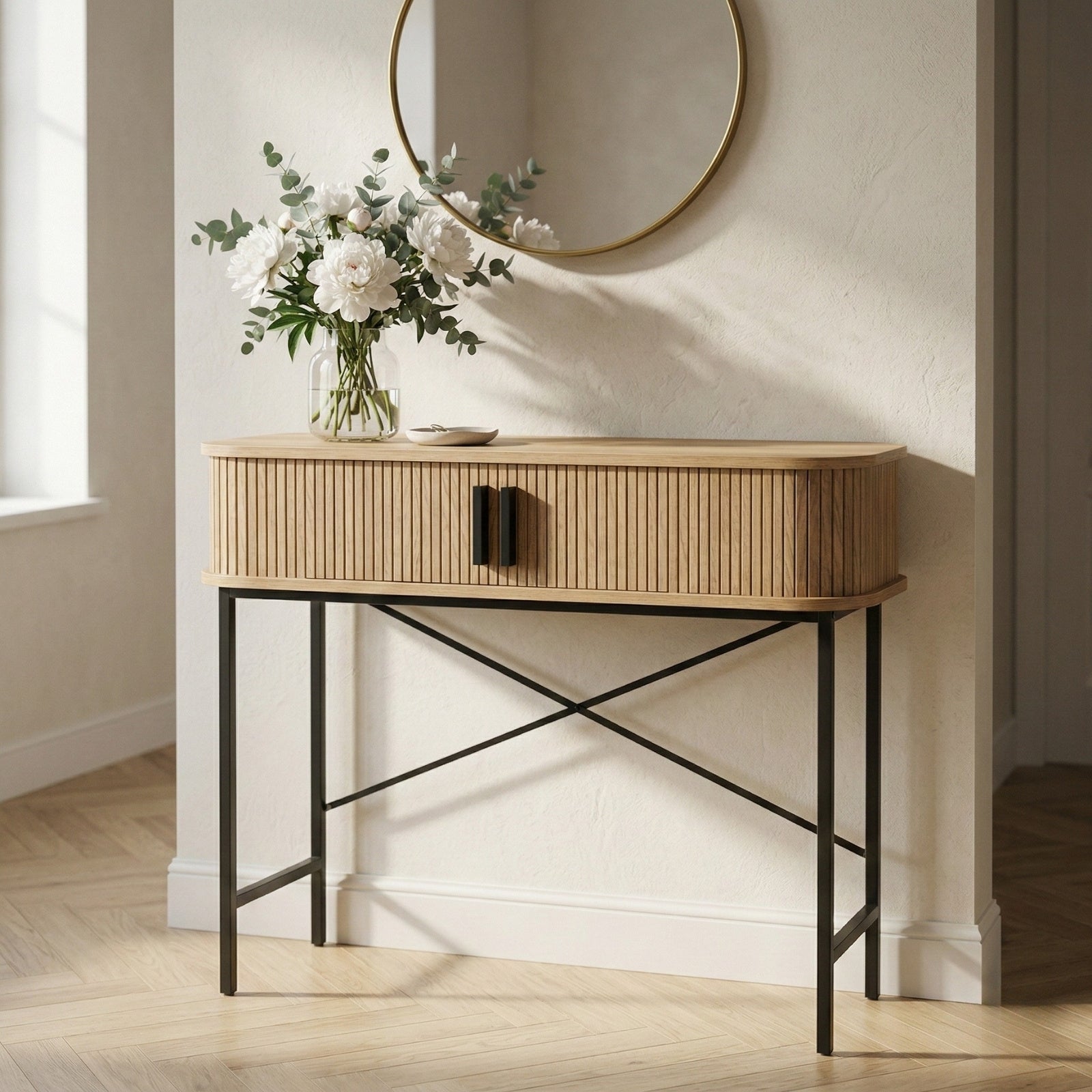 Wąska konsola do przedpokoju SCAVA 100 x 35 cm – mebel z lamelami i przesuwanymi drzwiami, idealny do niewielkiego korytarza