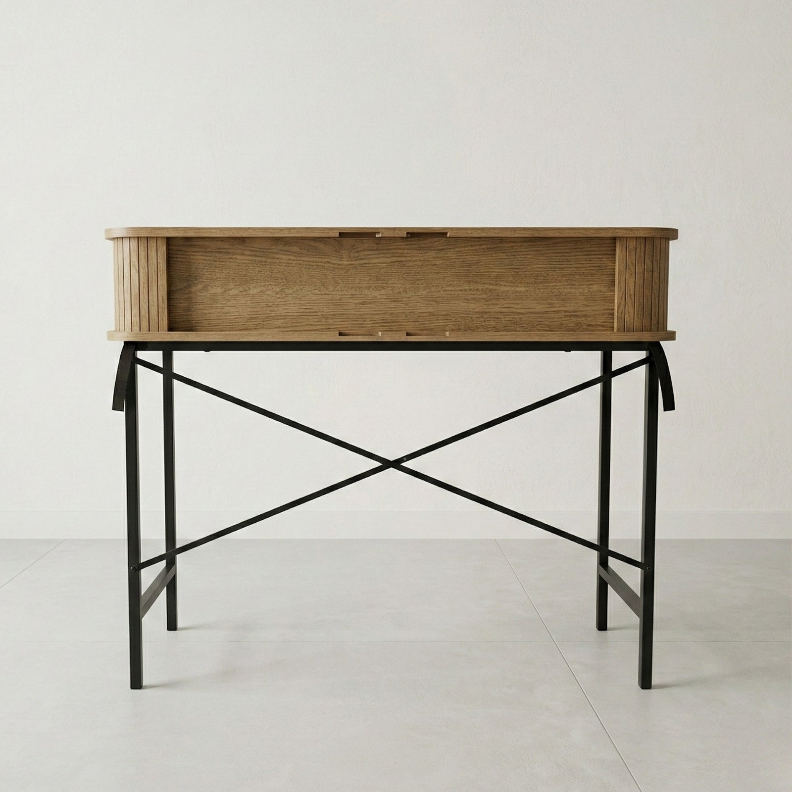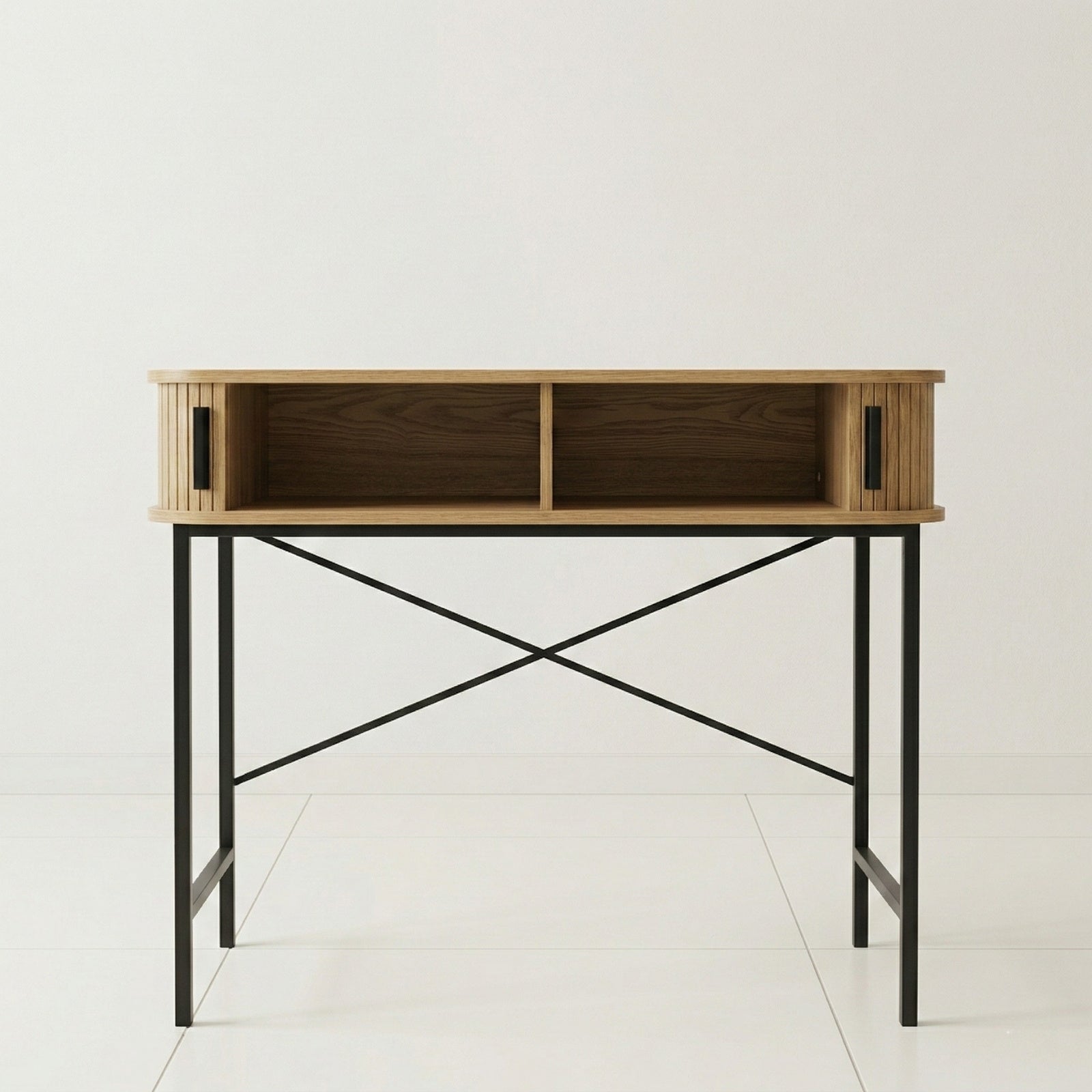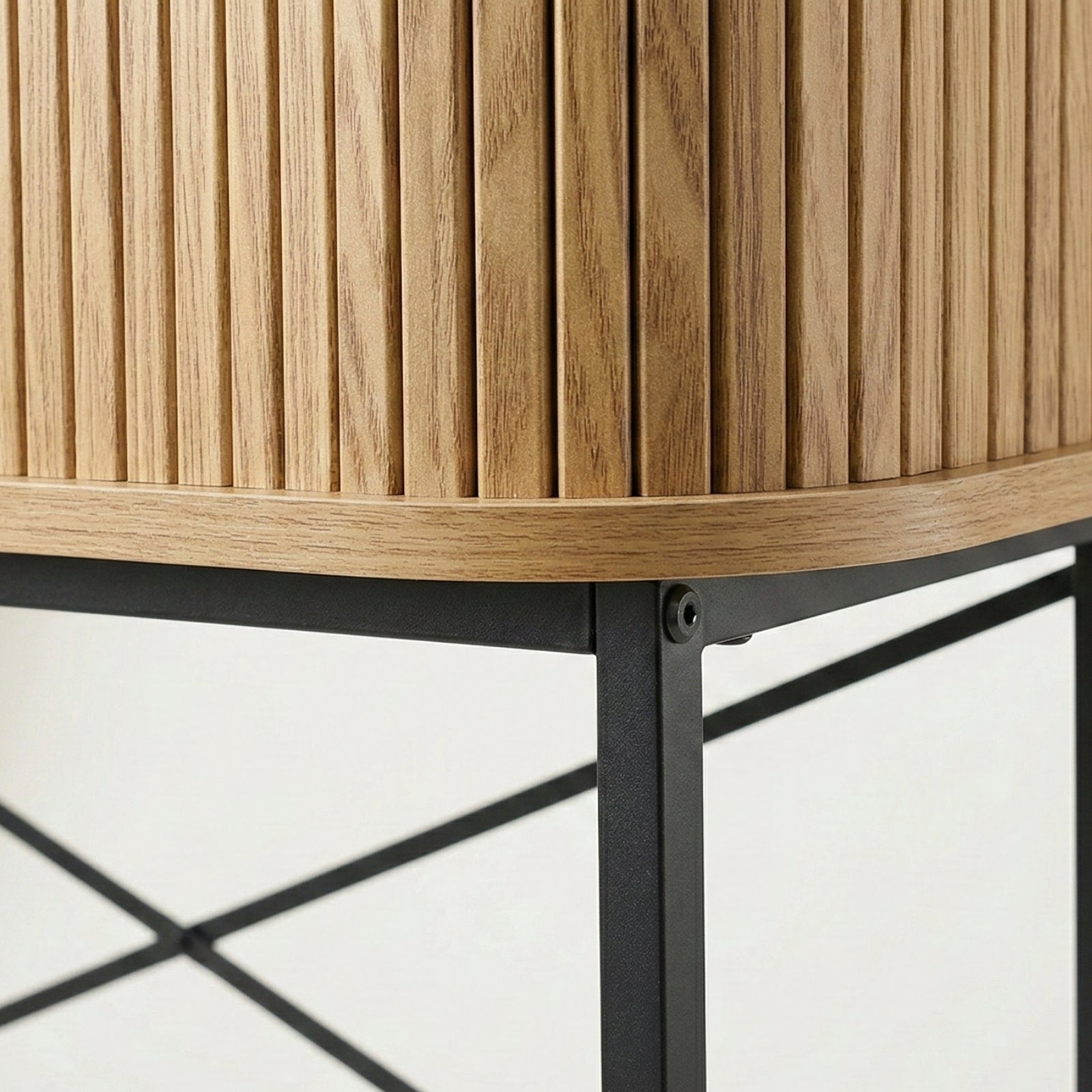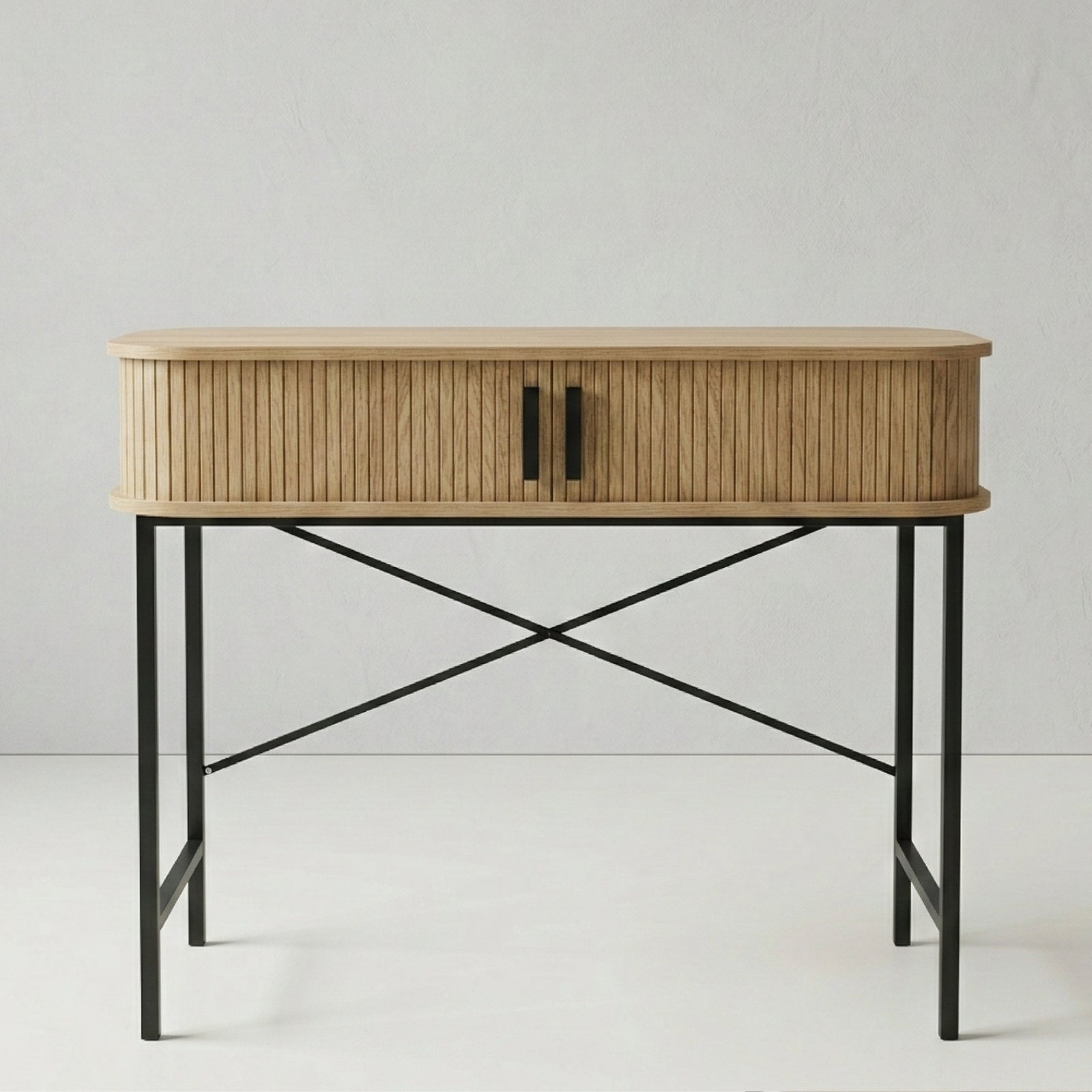 - Designerski front z lamelami: Konsola wyróżnia się efektownym frontem z ryflowanych lameli oraz praktycznymi, przesuwanymi drzwiami harmonijkowymi, które dodają wnętrzu nowoczesnego charakteru.