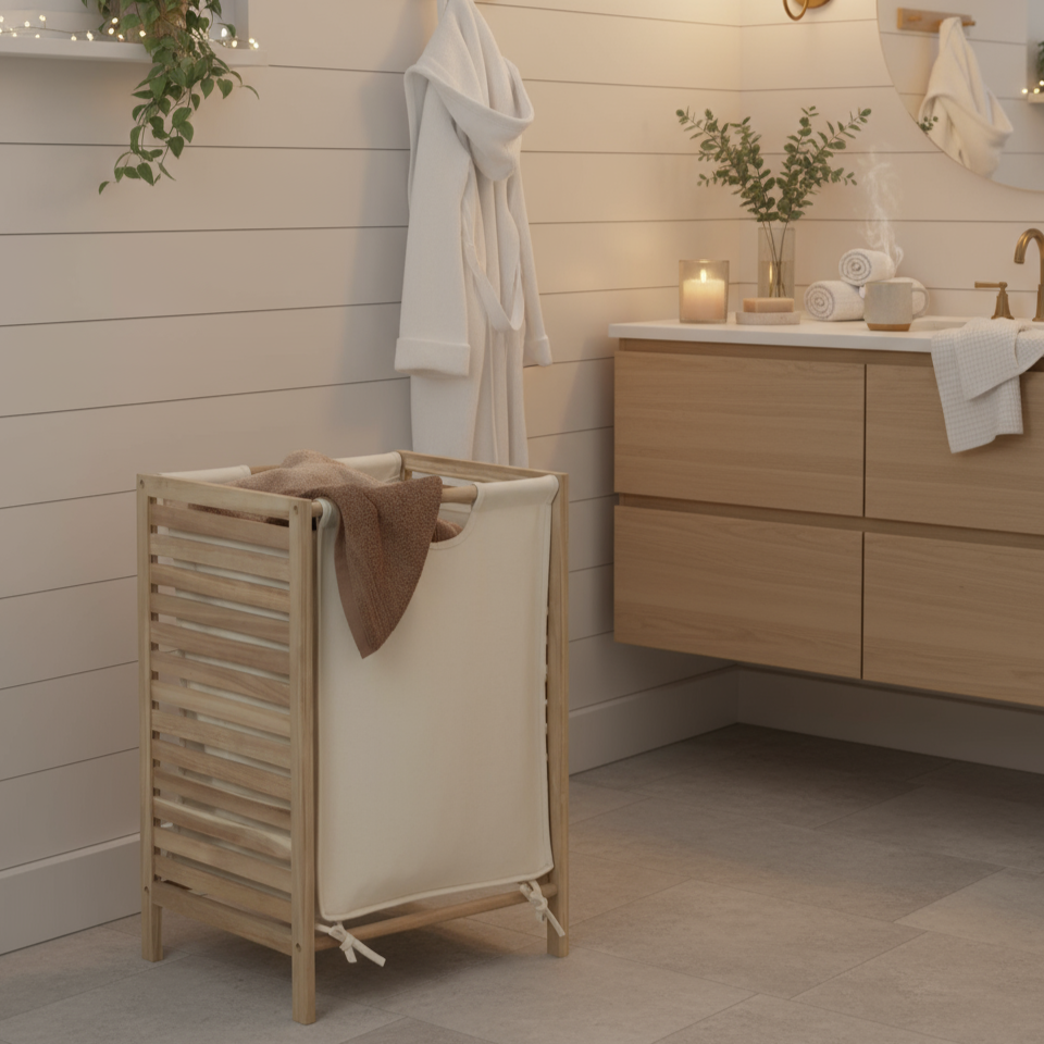 - Drewniany stelaż zapewnia stabilność: Solidna rama wykonana z drewna akacjowego sprawia, że kosz na pranie stoi bezpiecznie. Konstrukcja utrzymuje porządek.