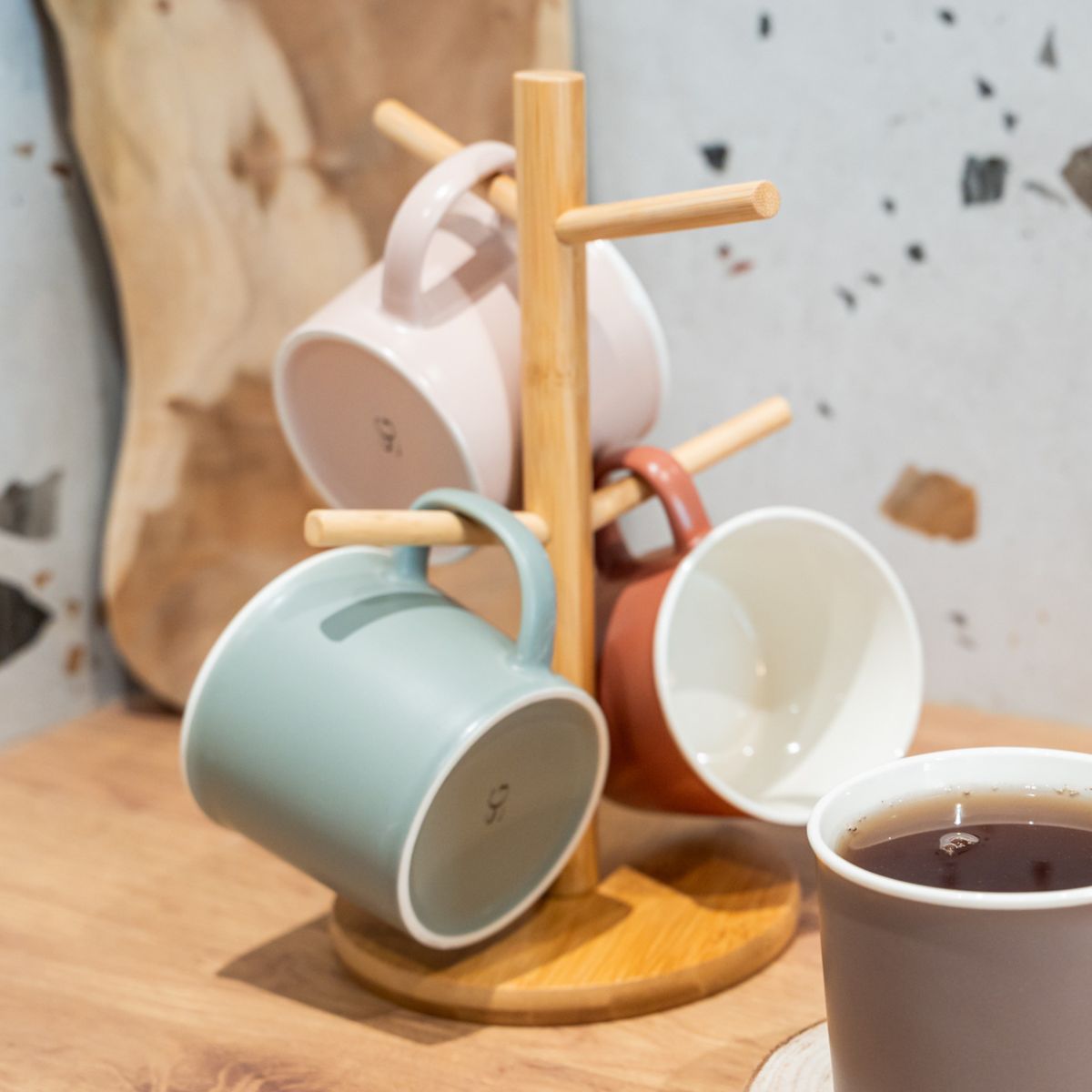 Do zestawu dołączony został elegancki stojak, na który odwiesisz naczynia. Takie rozwiązanie pozwala na dużą oszczędność miejsca w szafkach kuchennych. Dodatkowo tak pomyślany sposób układania kubków to fantastyczny sposób na ożywienie i urozmaicenie wystroju Twojej kuchni. Ten rodzinny zestaw pozwoli Ci cieszyć się wspólnie spędzonym czasem ze swoimi bliskimi.