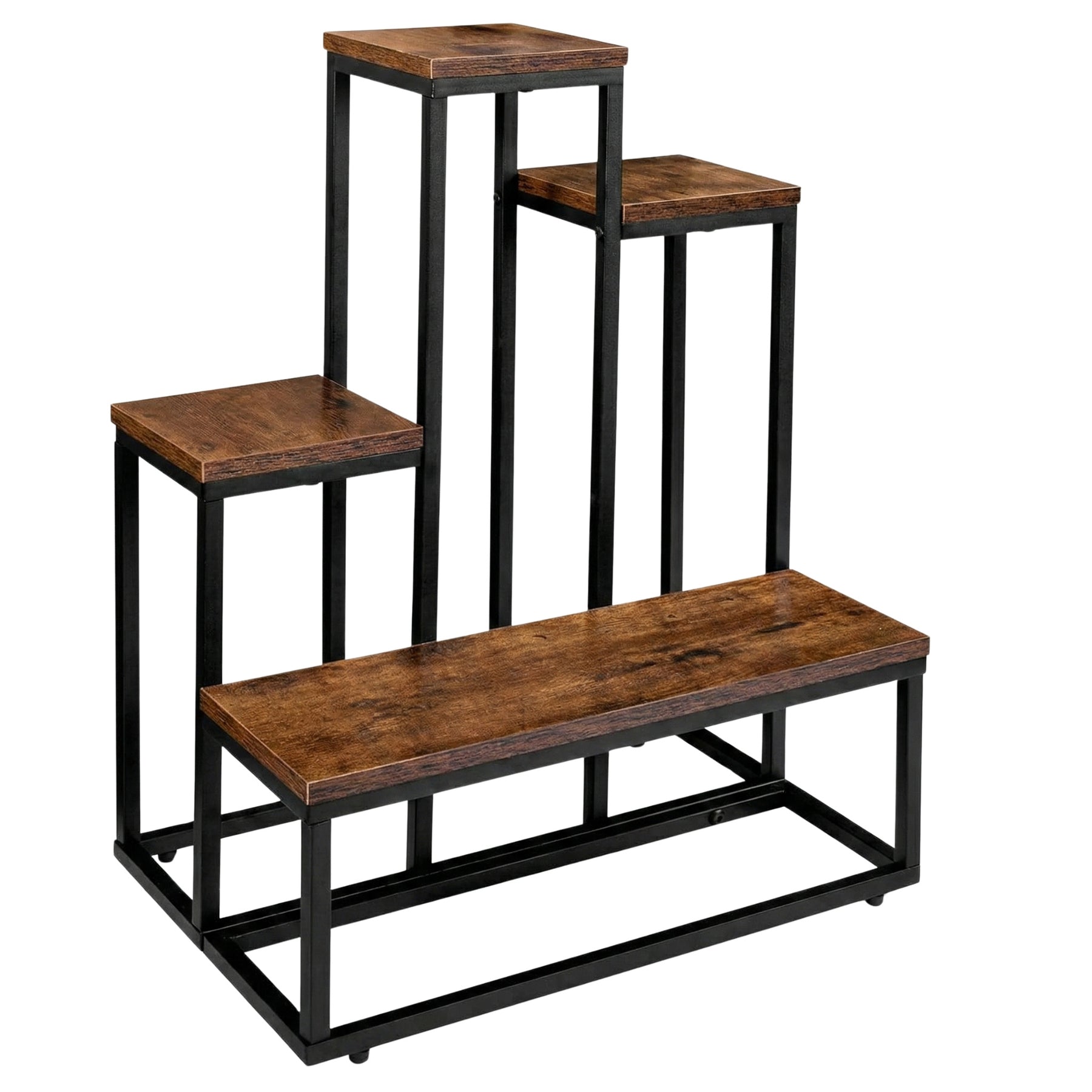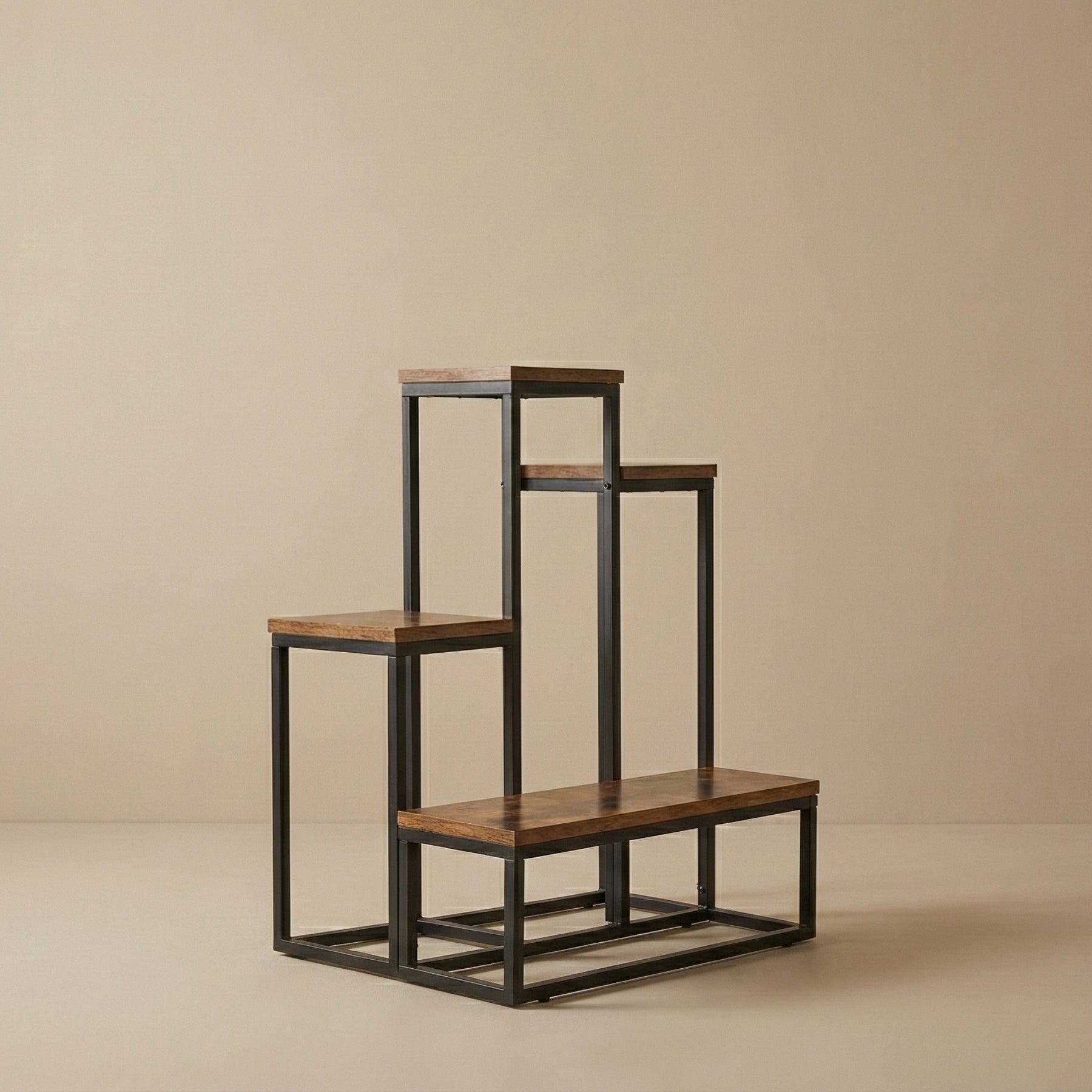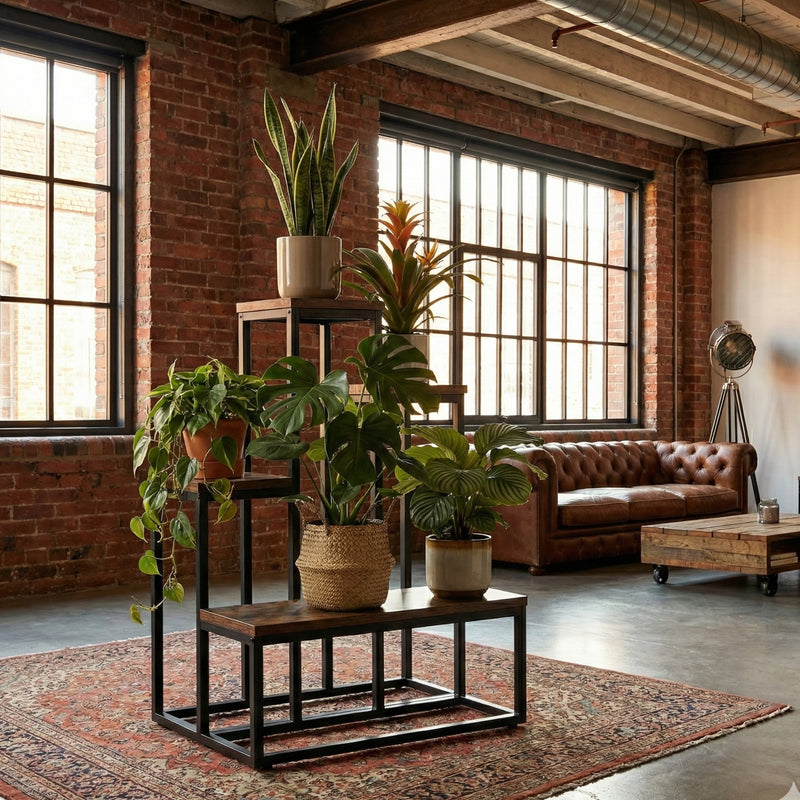 Metalowy stojak na kwiaty loftowy ILO – asymetryczny regał na rośliny w ciemnym drewnie
