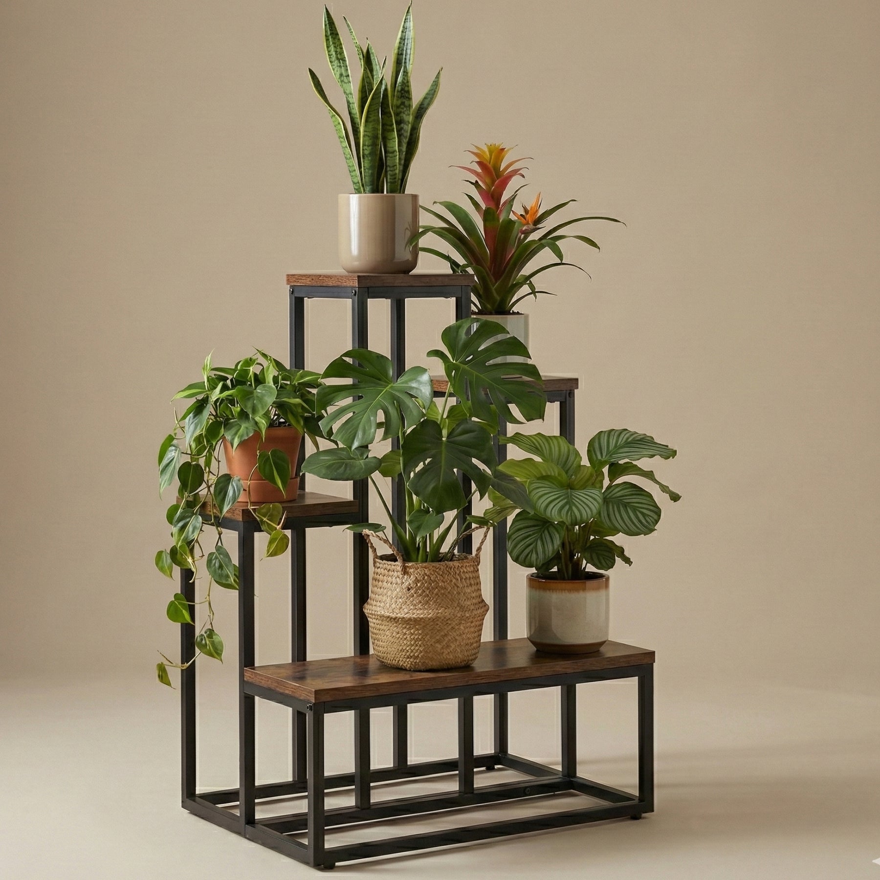 - Zwiększona wytrzymałość: Główna, najszersza półka została zaprojektowana z myślą o większych roślinach (nośność do 10 kg), podczas gdy mniejsze półki idealnie wyeksponują lżejsze okazy (do 5 kg).