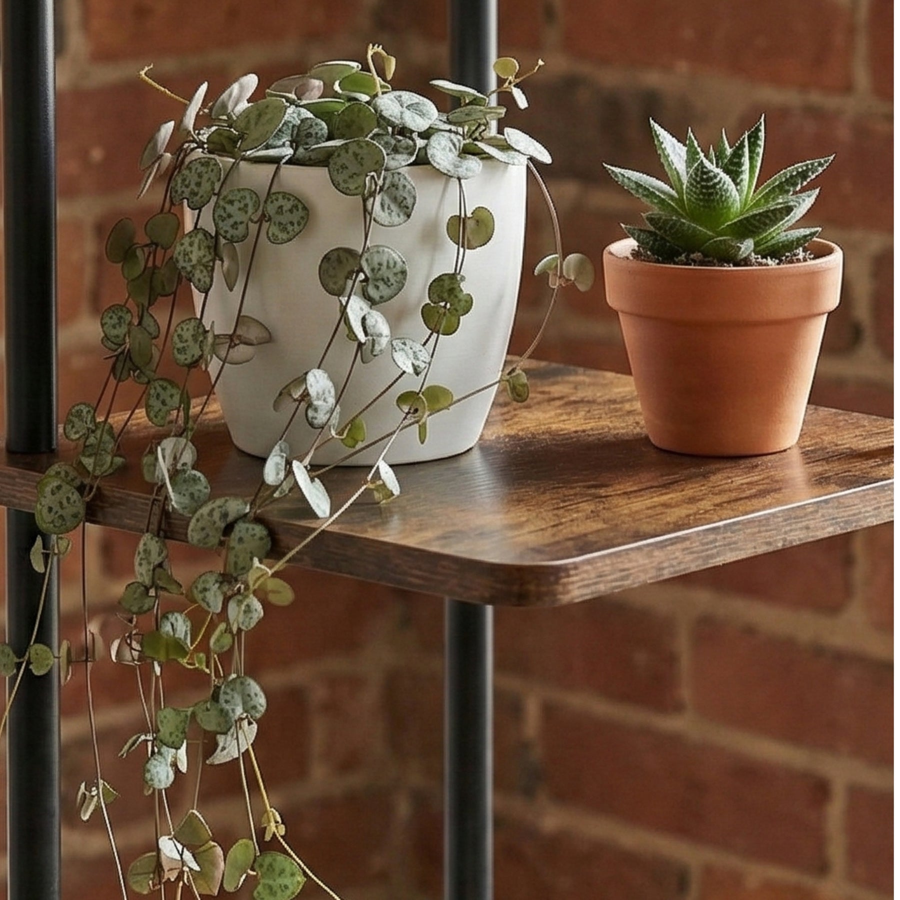 - Przemyślany układ: Różne odstępy między poziomami umożliwiają ustawienie zarówno niskich sukulentów, jak i wyższych okazów lub roślin wiszących.