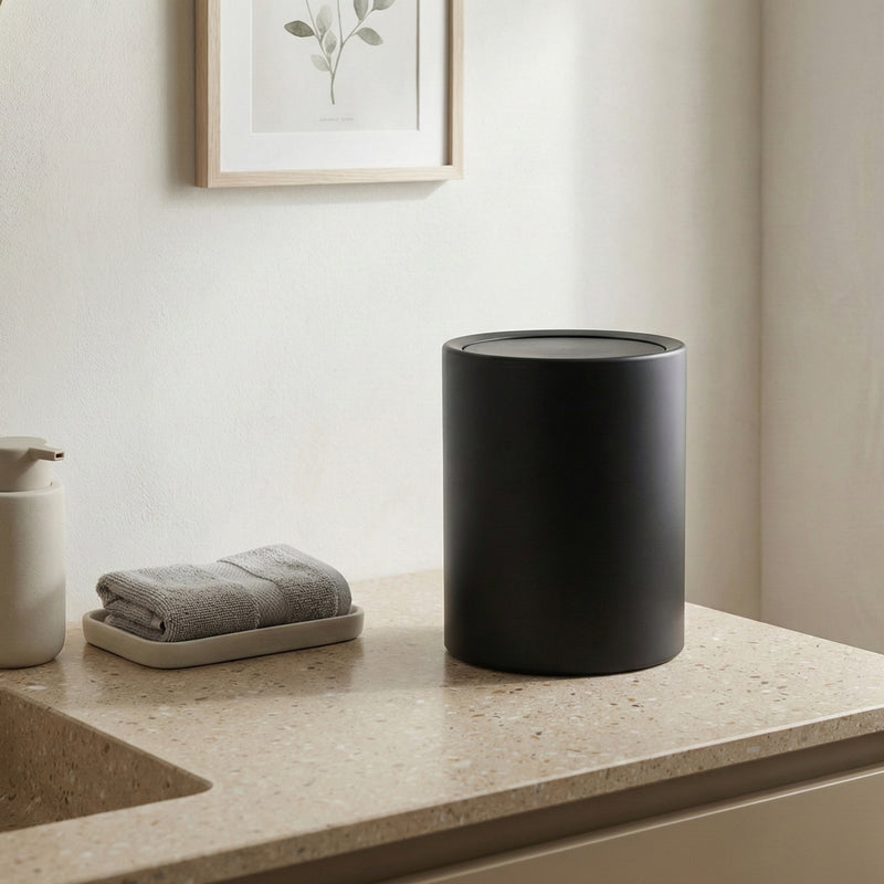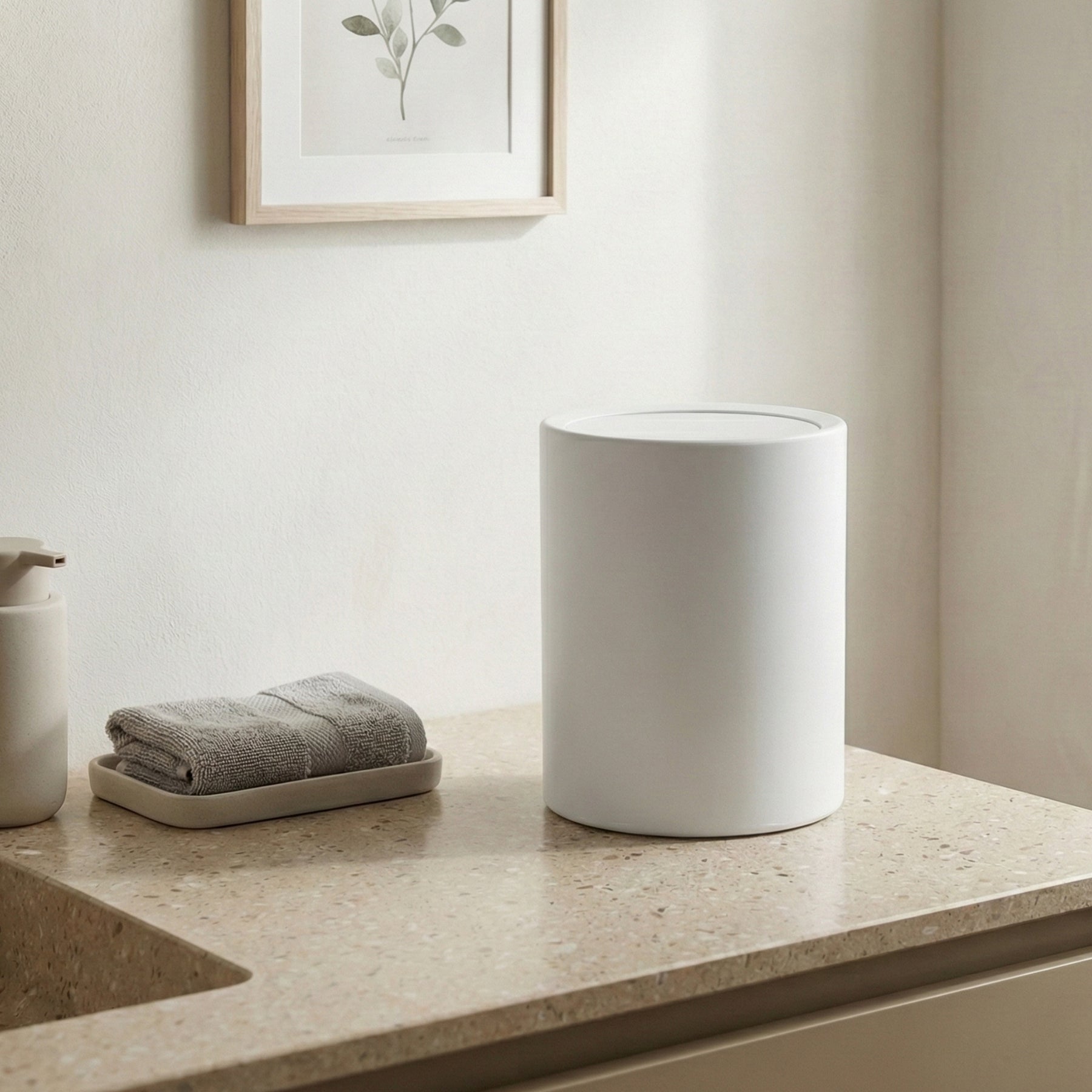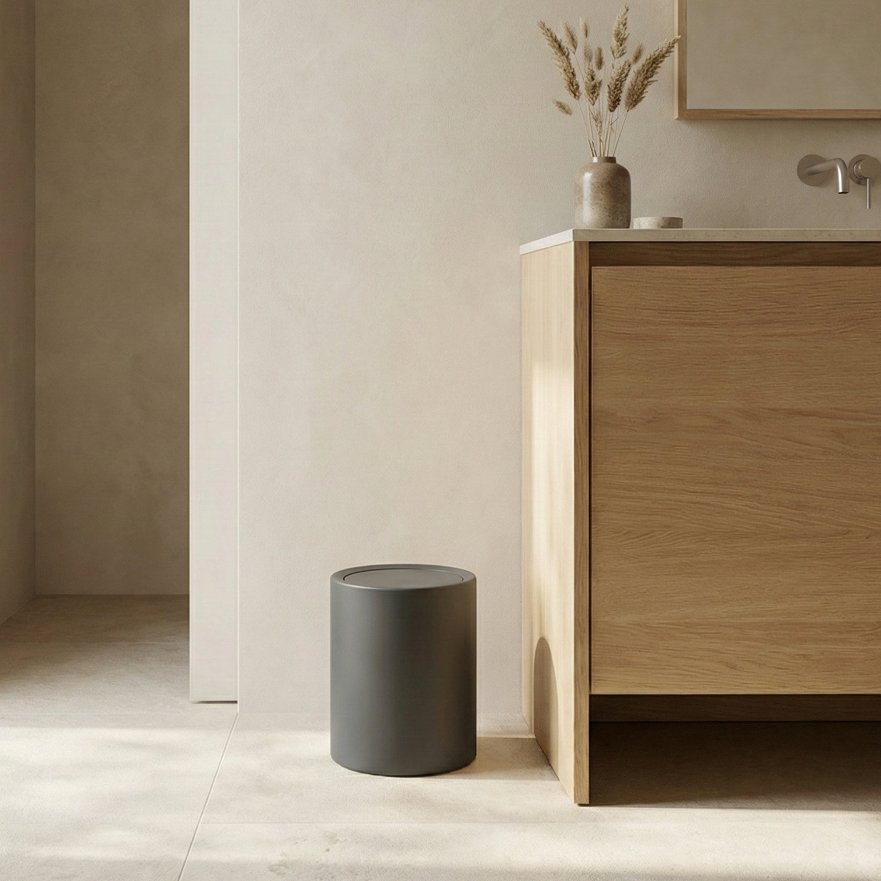 Kosz RUND to idealny przykład produktu, który łączy funkcjonalność z dyskrecją. Dzięki sprytnej konstrukcji z nakładaną pokrywą, zawartość kosza pozostaje zawsze niewidoczna, co znacząco wpływa na estetykę łazienki.