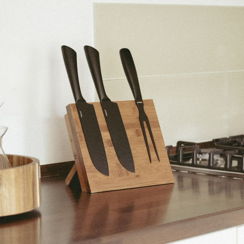 - Estetyczny akcent: Smukły design z bambusa w kolorze dymnego drewna dodaje kuchni naturalnego uroku. Z jego pomocą zaprezentujesz noże w elegancki sposób i będziesz je miał/miała zawsze pod ręką.