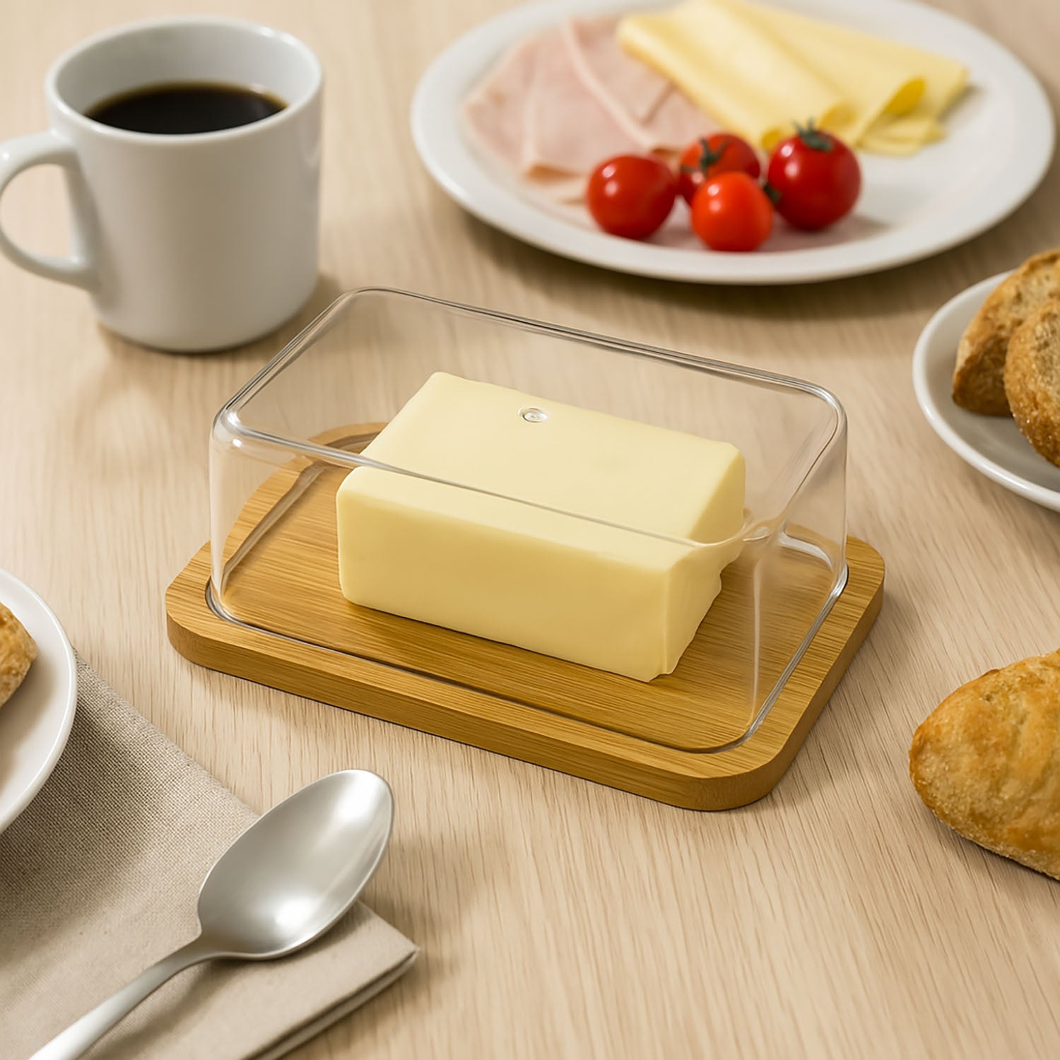 Drewno bambusowe zapewnia cyrkulację powietrza przy jednoczesnym dbaniu o świeżość i nie psuciu się produktu. Zamknięte opakowanie pozwala na ochronie żywności przed czynnikami zewnętrznymi. Maselniczka posiada wieko z tworzywa sztucznego, które prezentuje się niezwykle estetycznie i na stole wygląda schludnie.