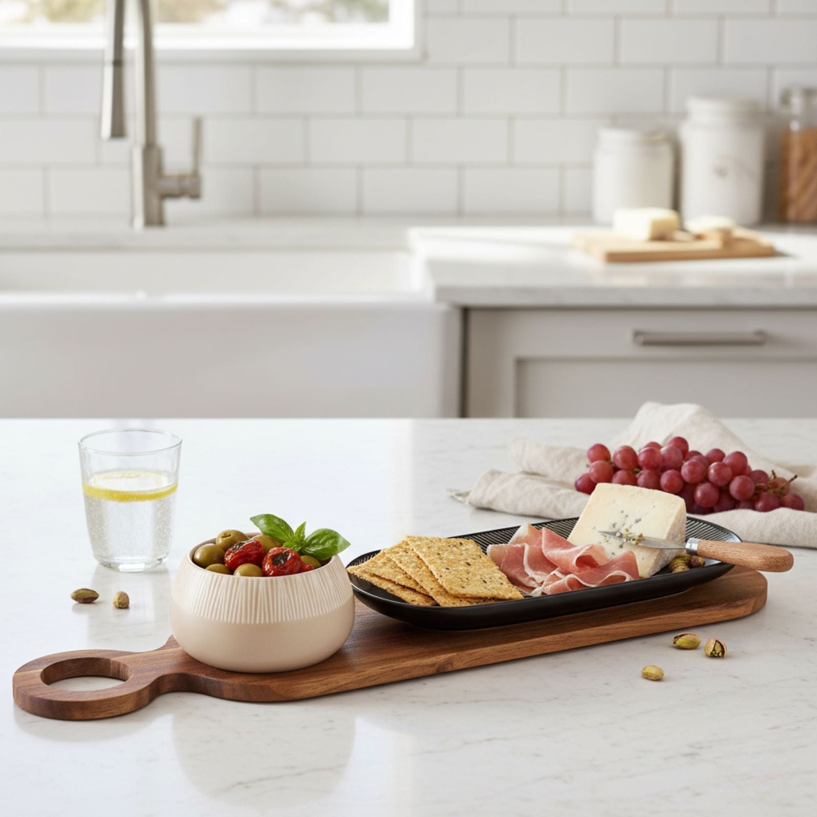 Zestaw do serwowania przekąsek z drewna akacjowego i ceramiki - elegancki i funkcjonalny zestaw idealny do każdej kuchni