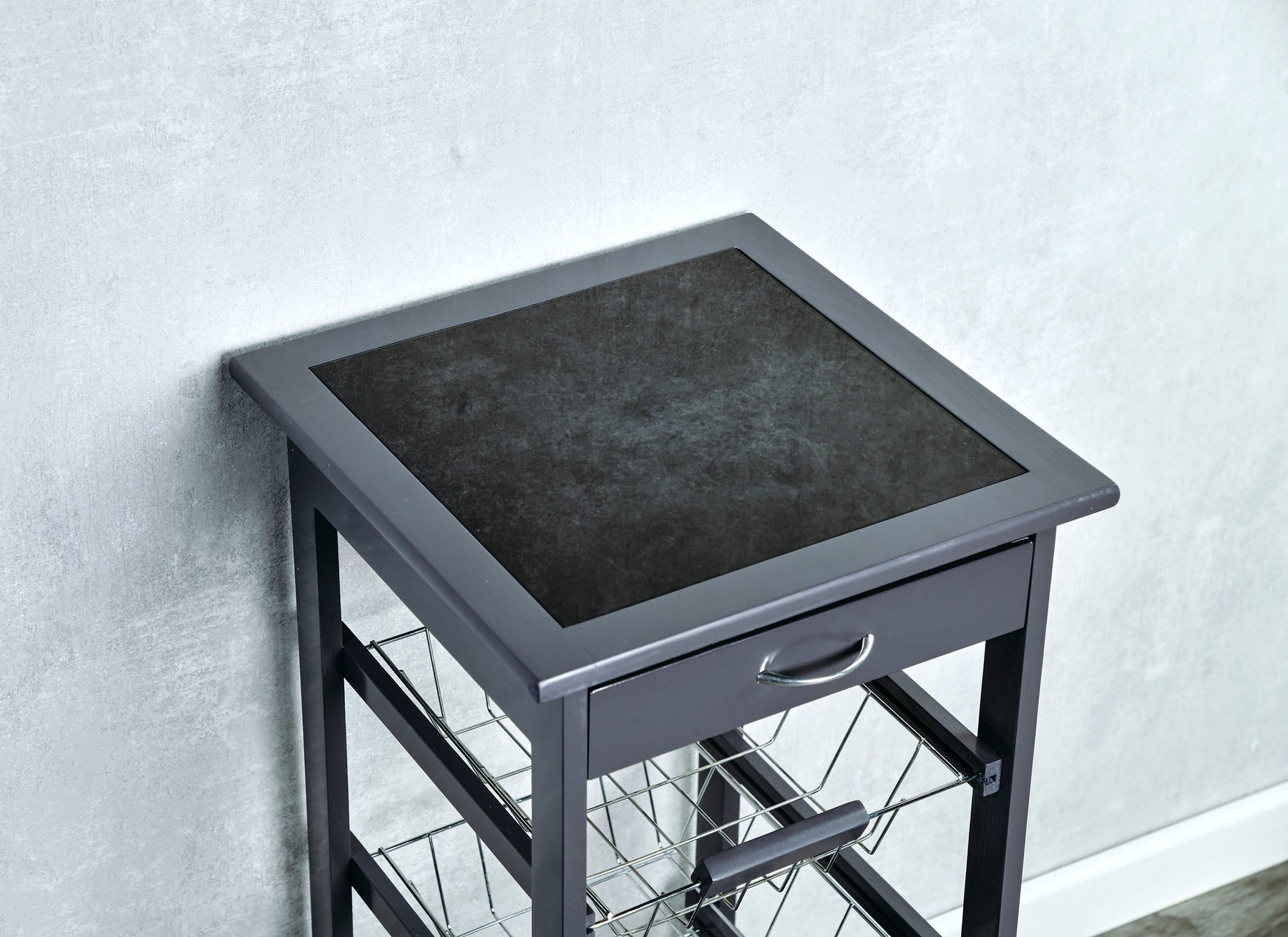 - Praktyczne przechowywanie: Wózek wyposażony jest w jedną szufladę i trzy wysuwane, metalowe kosze, co zapewnia dużą ilość miejsca do przechowywania kuchennych akcesoriów.