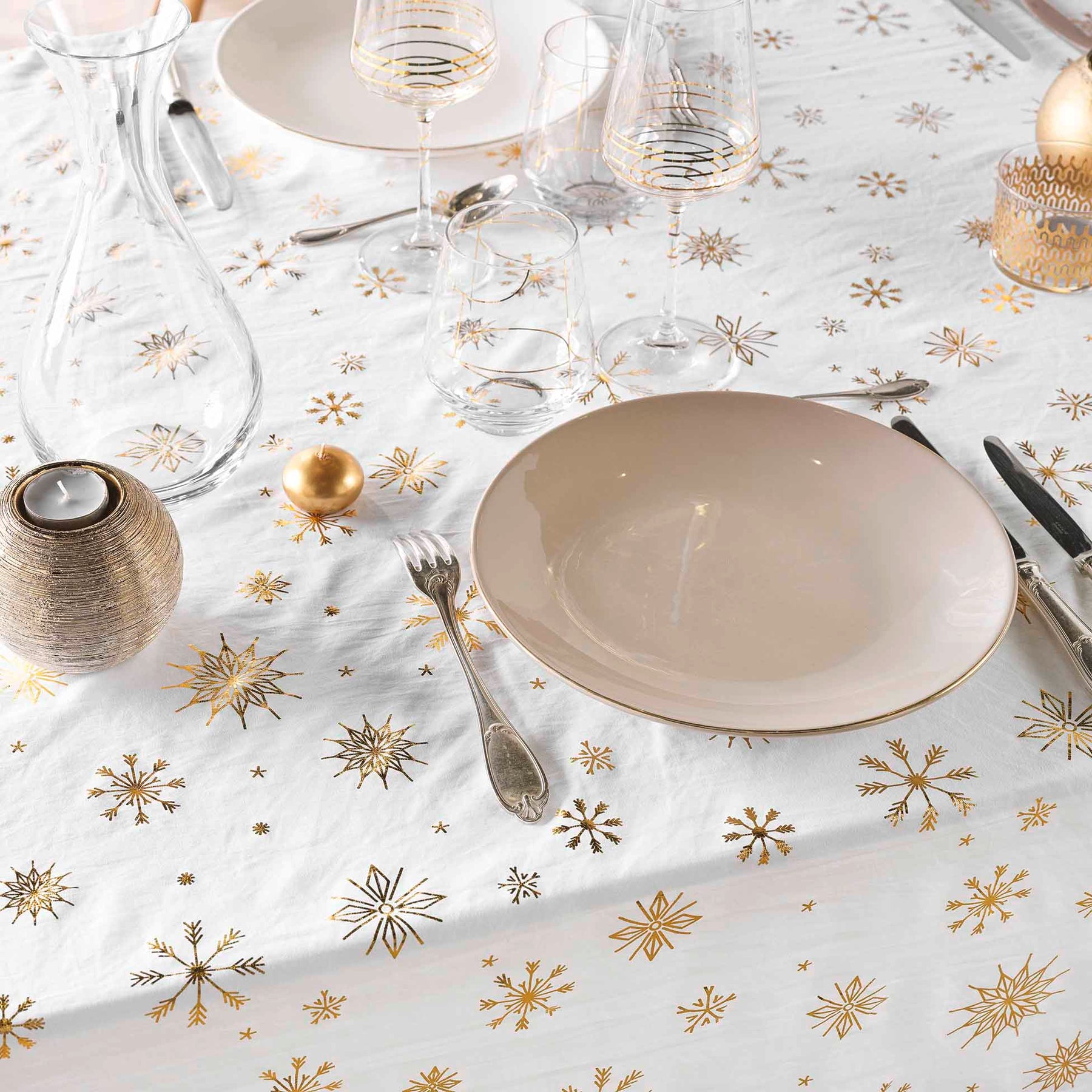 Elegancki obrus prostokątny 140x240 cm z poliestru z złotymi zdobieniami - wyjątkowy design, który doda elegancji Twoim wnętrzom