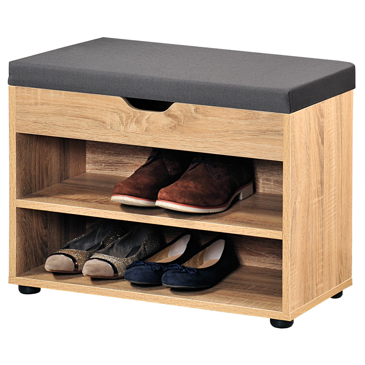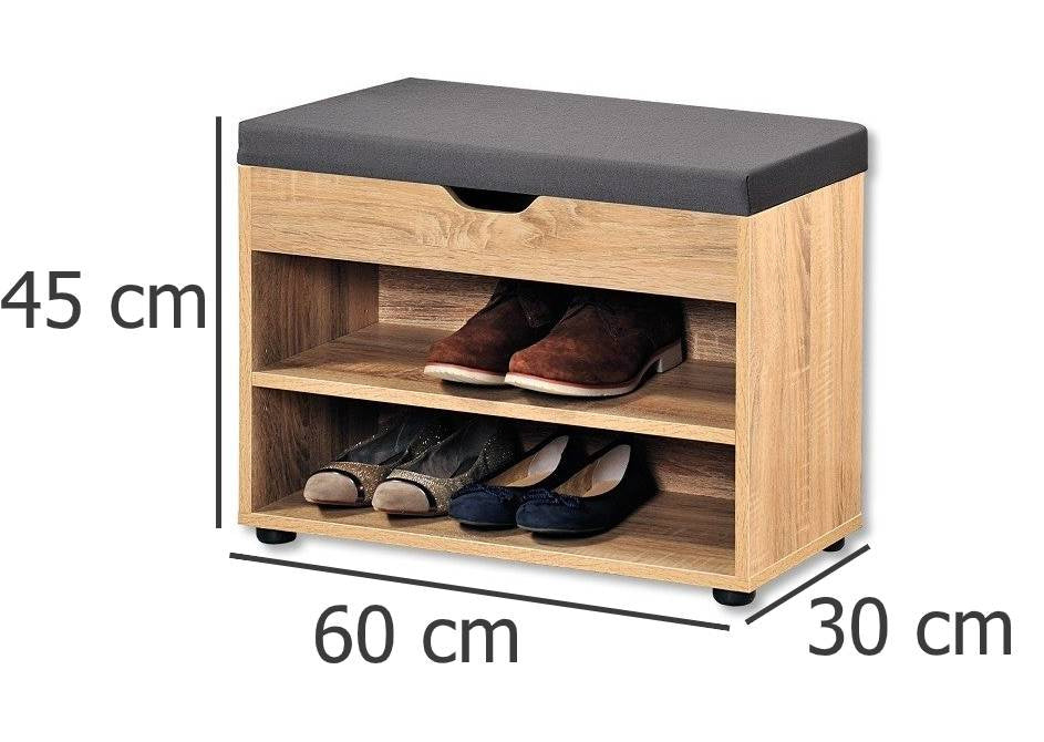 Siedzisko do przedpokoju budują dwie półki na buty i tapicerowana ławeczka, która jest jednocześnie uchylnym wiekiem dla przydatnego schowka na szale, apaszki i inne drobne elementy garderoby, jakie zechcesz mieć pod ręką w przedpokoju. Półka została wystylizowana na dębową komodę. Drewniana szafka na buty to praktycznie bardzo dobrej jakości regał. Szafka na obuwie pochodzi z kolekcji niemieckiej firmy Kesper, słynącej z funkcjonalnych rozwiązań dla domu, eleganckiego wzornictwa i troski o środowisko naturalne. Prezentowany regał na buty wykonany został z solidnej, gwarantującej trwałość, płyty wiórowej oznaczonej certyfikatem FSC. Mimo niewielkich gabarytów, doskonałych do małych pomieszczeń, stojak na buty pomieści nawet 6 par obuwia.