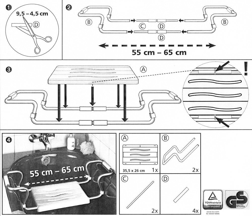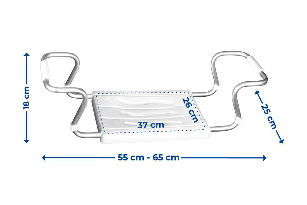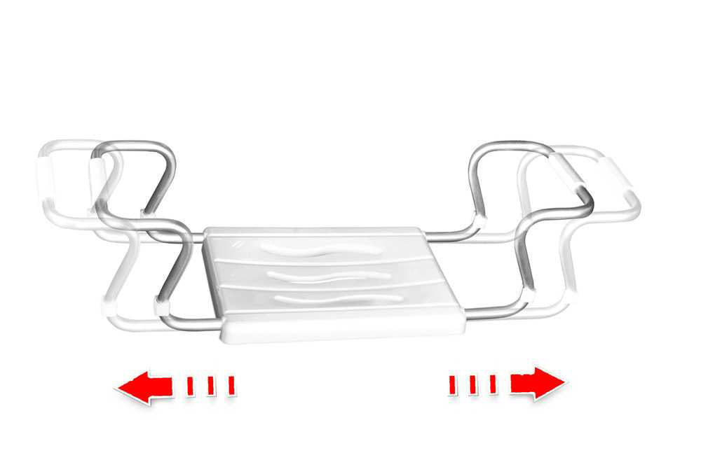 Profilowane, wygodne siedzisko zapewnia stabilność. Dzięki możliwości regulacji prętów na szerokość od 55 do 65 cm ławka pasuje do wszystkich standardowych wanien. Specjalne nakładki na aluminiowych prętach zapobiegają ponadto rysowaniu powierzchni wanny.