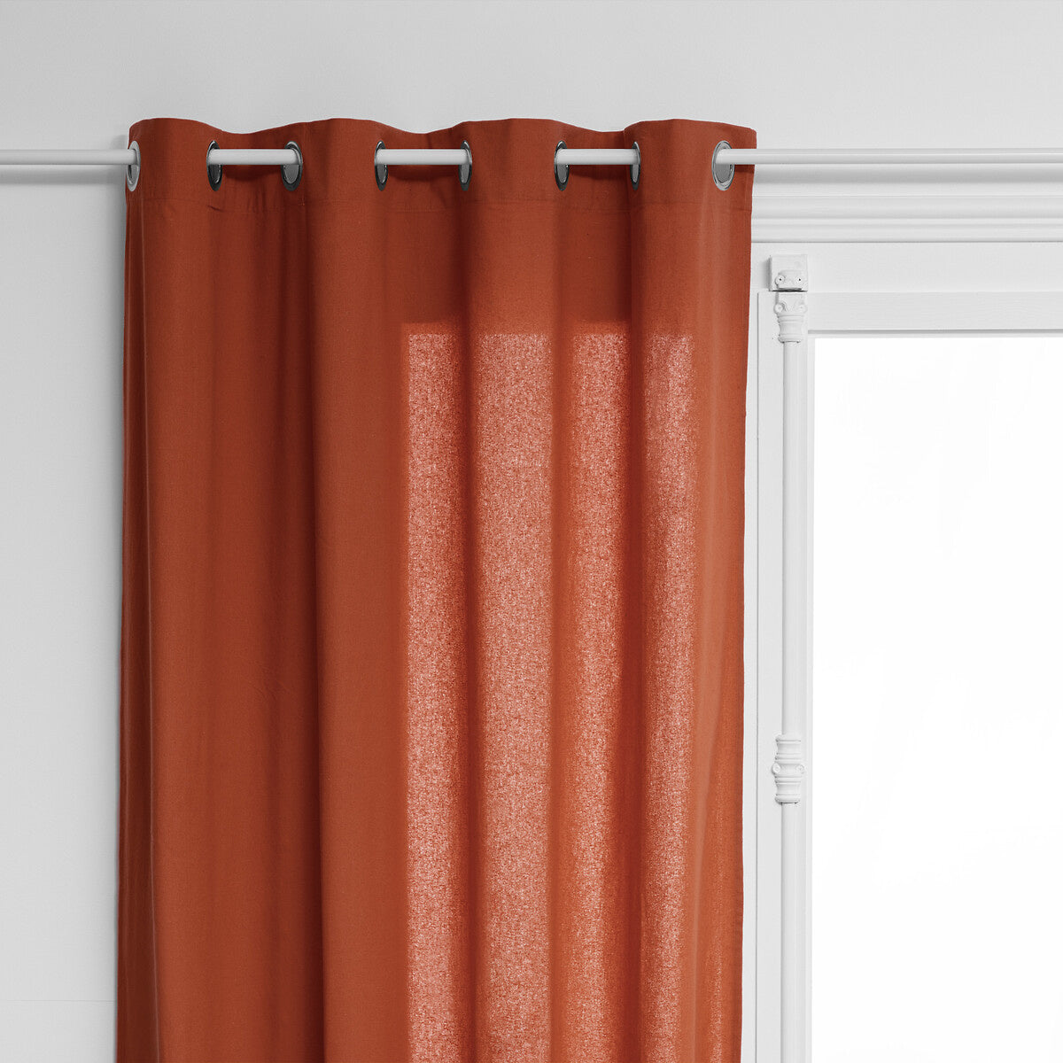 - Praktyczne przelotki: Zasłona jest wyposażona w przelotki, co ułatwia jej zawieszenie i zapewnia płynne przesuwanie po drążku.
