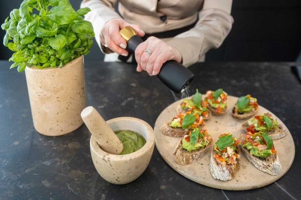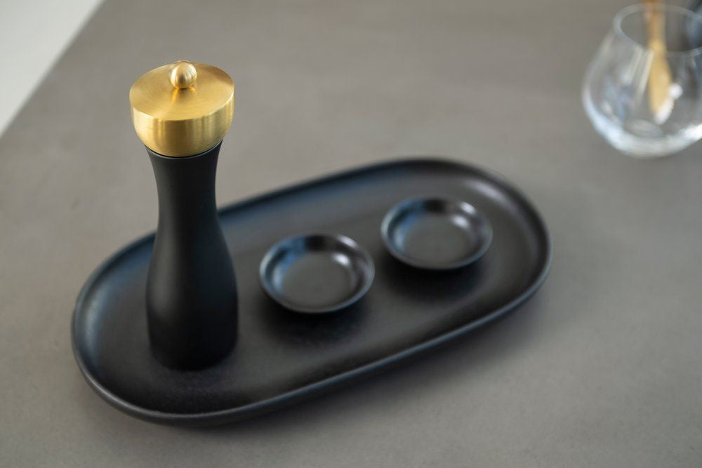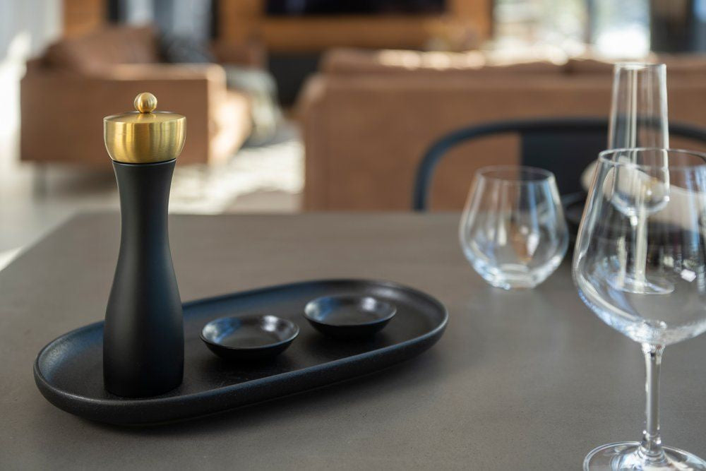 - Elegancki design: Ozdobny młynek do soli lub pieprzu Maku łączy w sobie nowoczesny styl z funkcjonalnością, idealnie wpisując się w każdą kuchnię. Jego czarna powierzchnia z złotym detalem przyciąga wzrok i dodaje klasy każdemu posiłkowi.