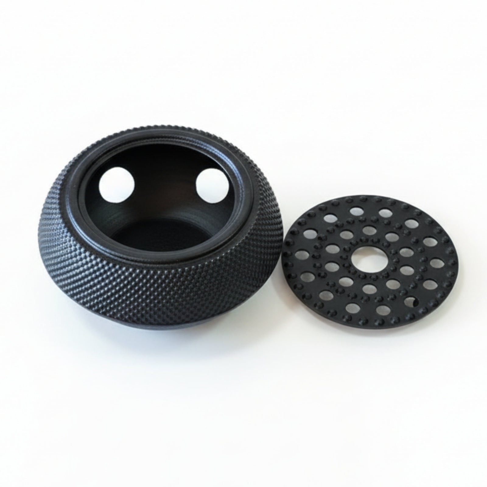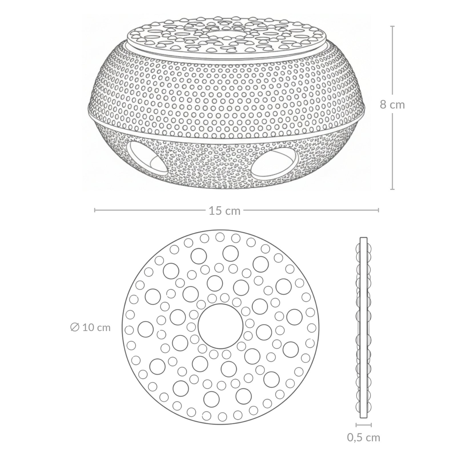 - Funkcjonalna pokrywa: Wyciągane wieczko o średnicy 10 cm i wysokości 0,5 cm umożliwia łatwą wymianę świecy typu tealight. W dolnej części pogrzewacza znajdują się dziurki, które zapewniają odpowiednią cyrkulację powietrze. Natomiast górny element - funkcjonalne wieczko ma na powierzchni niewielkie dziurki, które równomiernie rozprowadzają ciepło i pozwalają na podgrzanie dna czajniczka. Dodatkowo stabilność dzbanka zapewniają wypukłe elementy na powierzchni pokrywki.