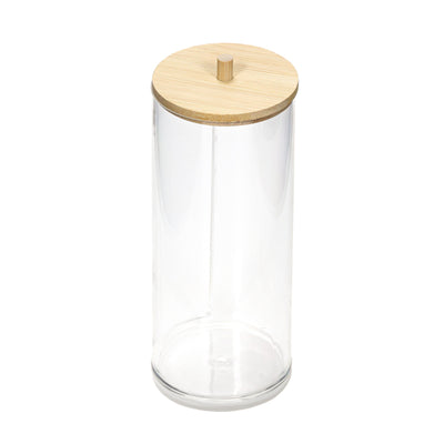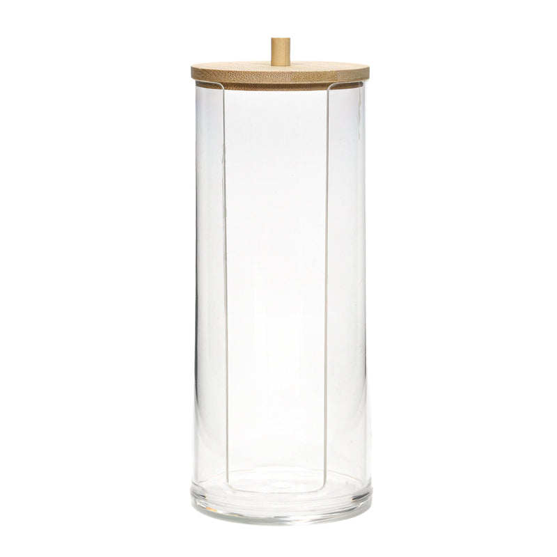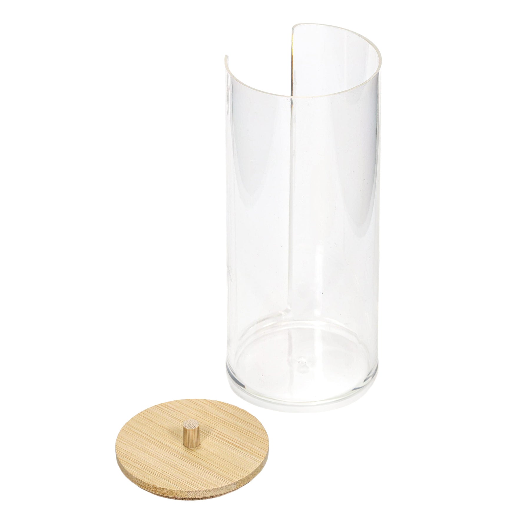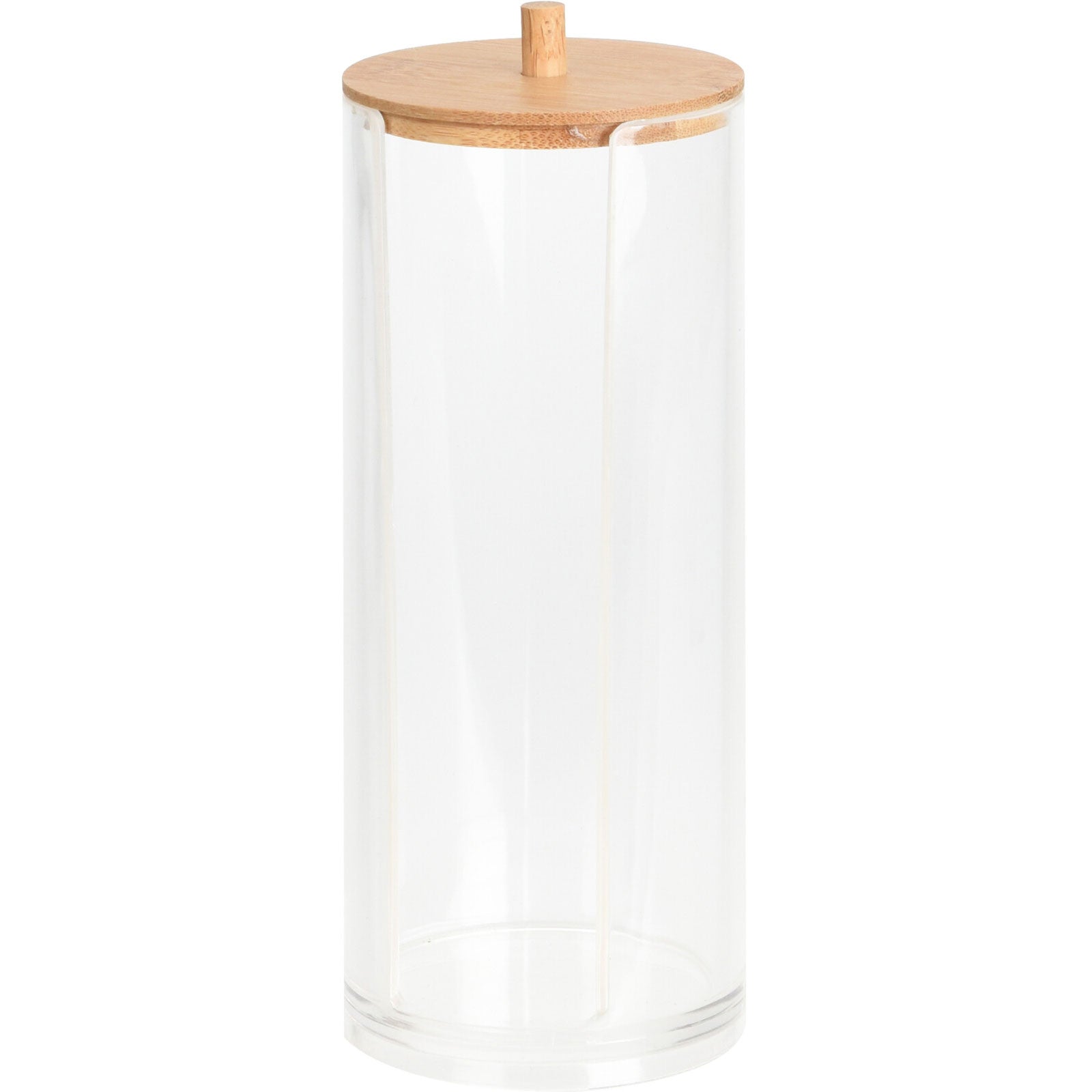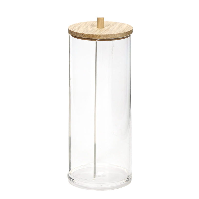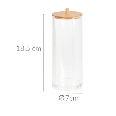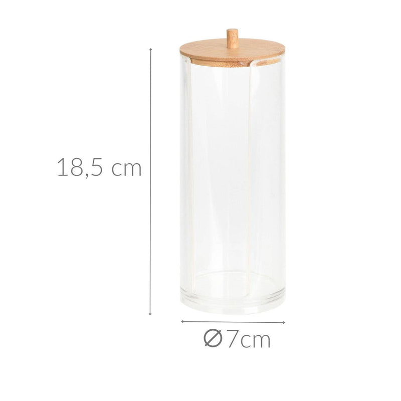 Pojemnik od marki ELEGANZA jest wysoki na 18,5 cm, a jego średnica to 7 cm. Pomieści wiele płatków kosmetycznych, a przezroczyste ścianki podpowiedzą Ci, kiedy będzie trzeba wybrać się na zakupy. Odporne tworzywo sztuczne jest odporne na wilgoć, wysoką temperaturę panującą w łazience oraz osiadanie kurzu. Ciekawym akcentem jest bambusowa pokrywka, która dodaje całości naturalnego wyglądu.