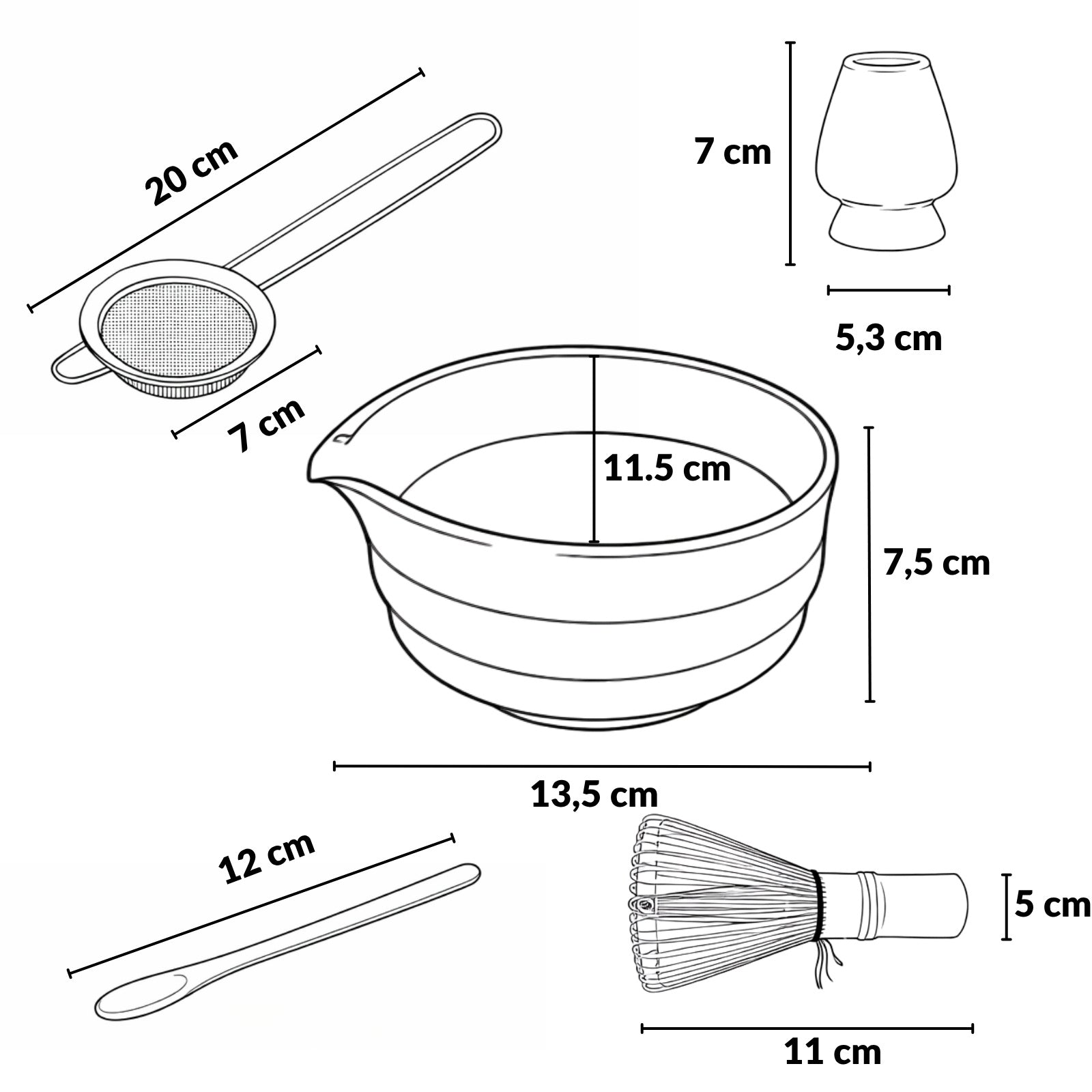 - Praktyczne wymiary: Miska o wymiarach 13,5 x 11,5 x 7,5 cm jest idealna do mieszania herbaty, a pozostałe akcesoria, takie jak uchwyt i miotełka, są zaprojektowane z myślą o wygodzie użytkowania. Dzięki kompaktowym rozmiarom zestaw łatwo przechować w kuchni.