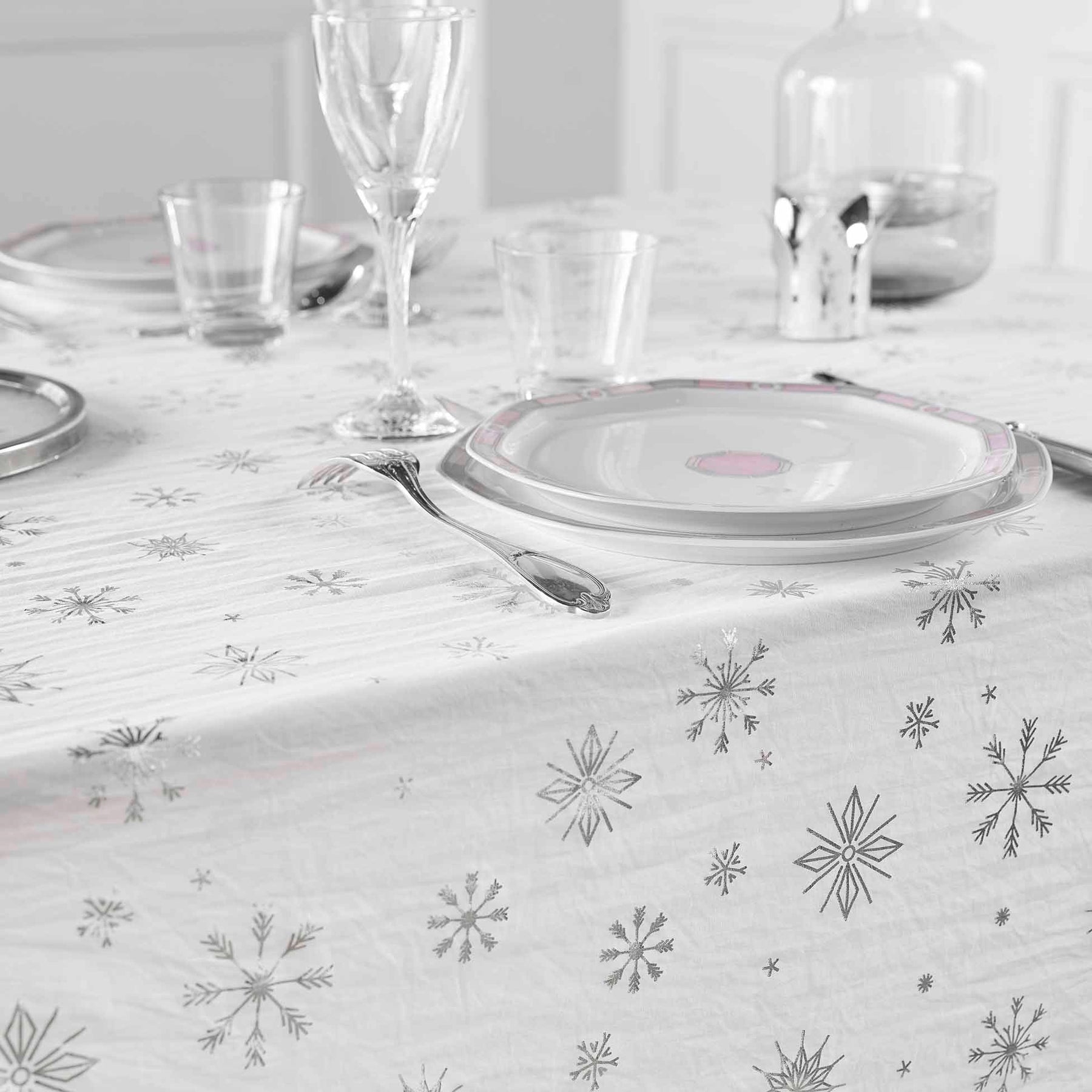 - Stylowe zdobienia: Srebrne wzory na białym tle nadają obrusowi nowoczesny wygląd, który doskonale komponuje się z różnorodnymi aranżacjami wnętrz, podkreślając ich elegancję.