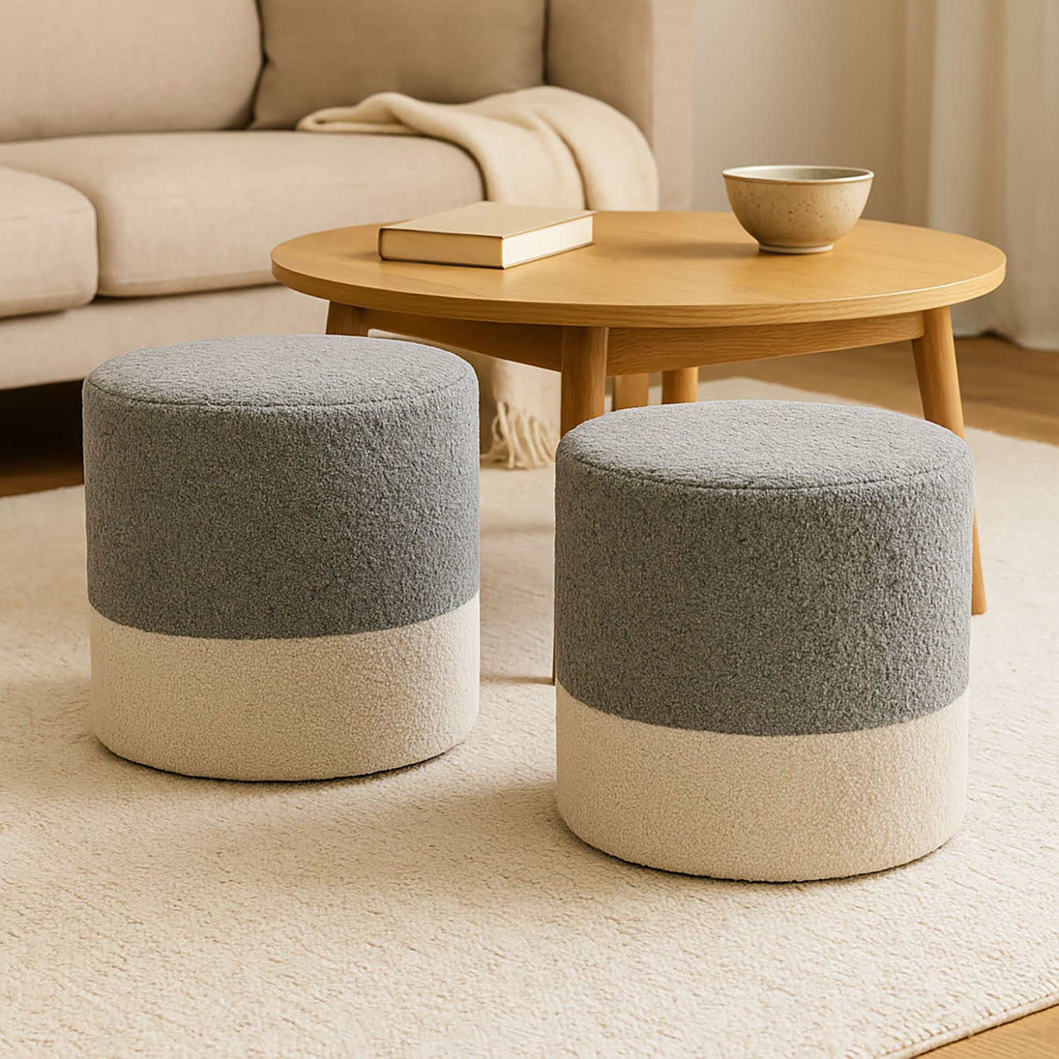 - Praktyczność i styl: Pufa okrągła tapicerowana w dwóch kolorach boucle to idealne połączenie funkcjonalności i estetyki. Dzięki wymiarom 35 x 35 x 34 cm, doskonale sprawdzi się w każdym pomieszczeniu, oferując dodatkowe miejsce do siedzenia lub jako podnóżek.
