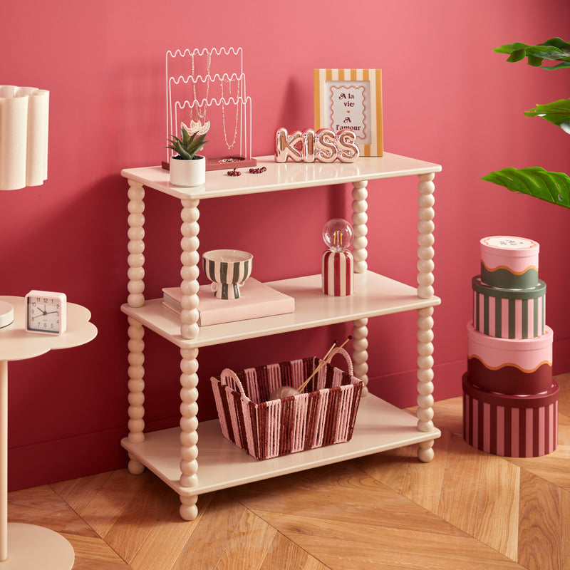 - Stylowy design: Oryginalne, obłe nogi w formie koralików nadają regałowi niepowtarzalny charakter, łącząc nowoczesność z klasycznym stylem. Jego delikatny beżowy kolor wprowadza do wnętrza lekkość i świeżość.
