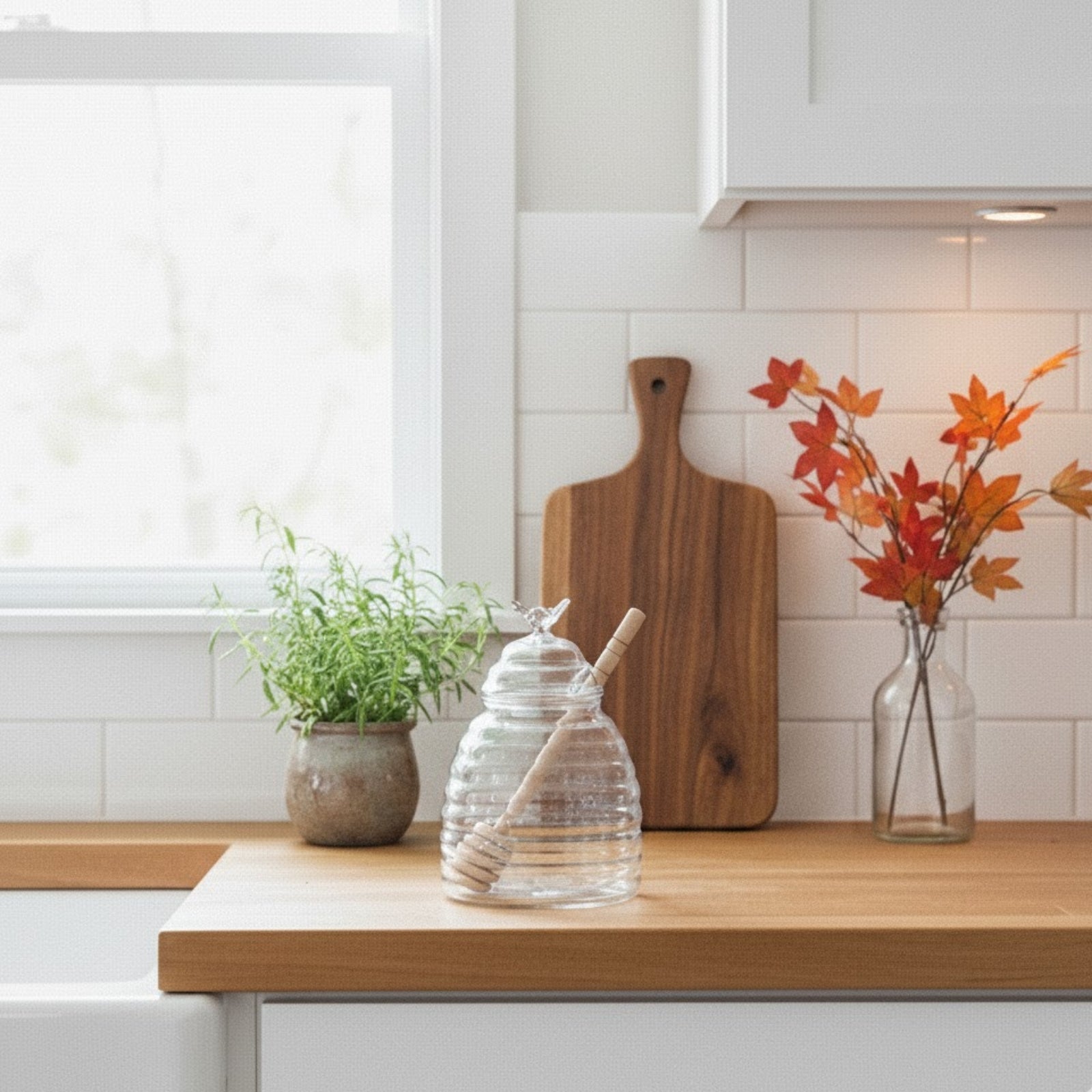 Prezentowany słoik z pokrywką został dodatkowo wyposażony w drewnianą łyżkę, ułatwiająca nakładanie miodu. To zatem bardzo funkcjonalny pojemnik na miód, który przy okazji urzeka swoim urokliwym wzornictwem. Polecamy do każdej eleganckiej i dobrze zorganizowanej kuchni.