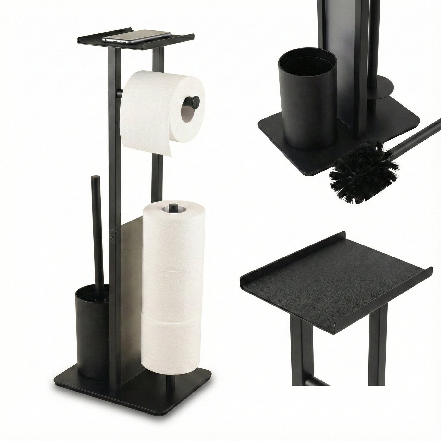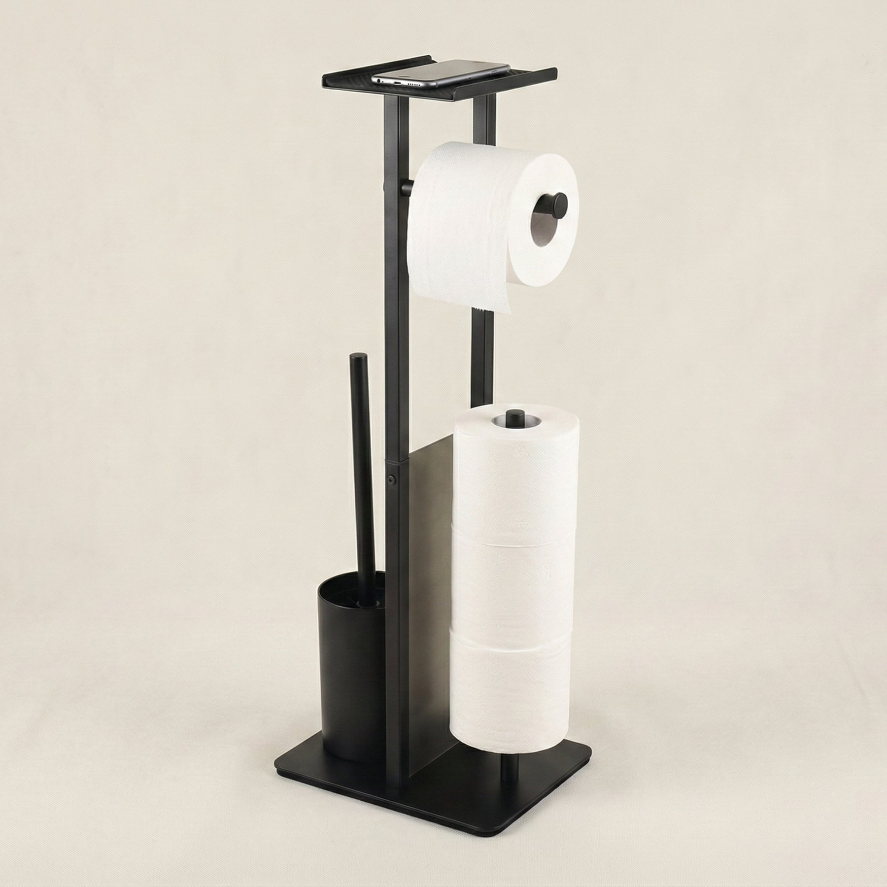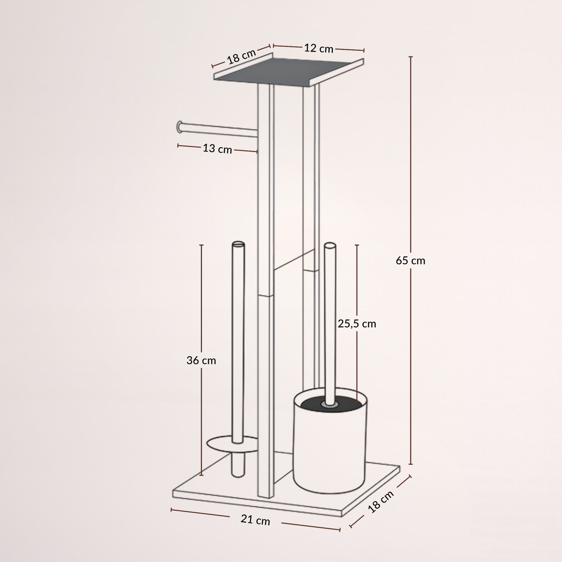 - Kompleksowe rozwiązanie 4w1: Stojak łączy w sobie aż cztery funkcje: uchwyt na rolkę papieru, pojemnik ze szczotką WC, praktyczny stojak na zapas papieru oraz półkę na drobiazgi.