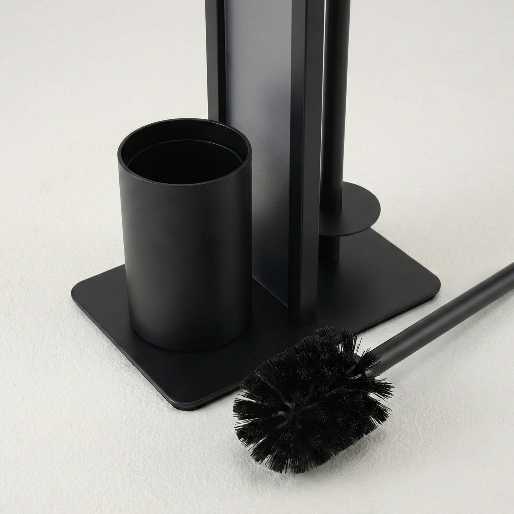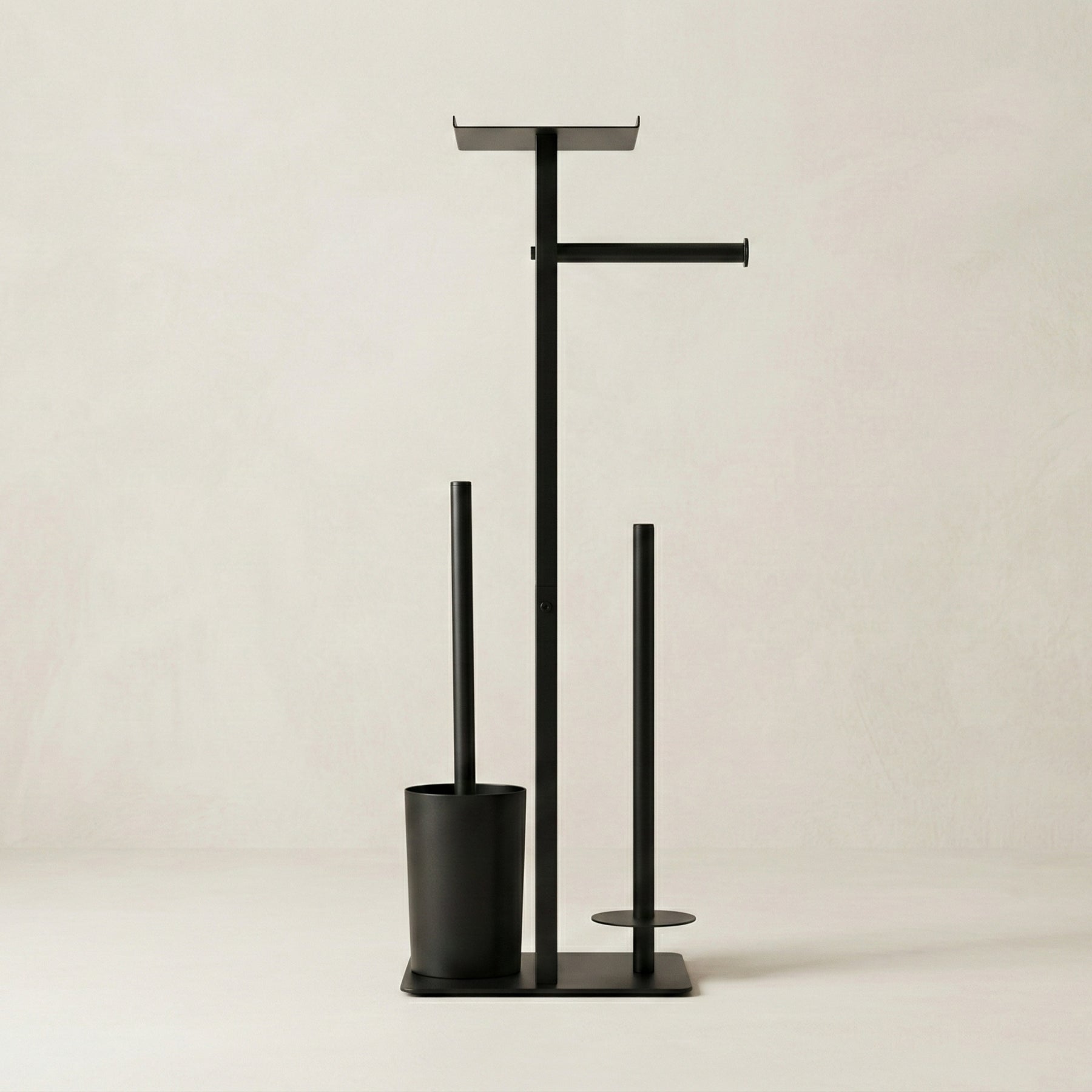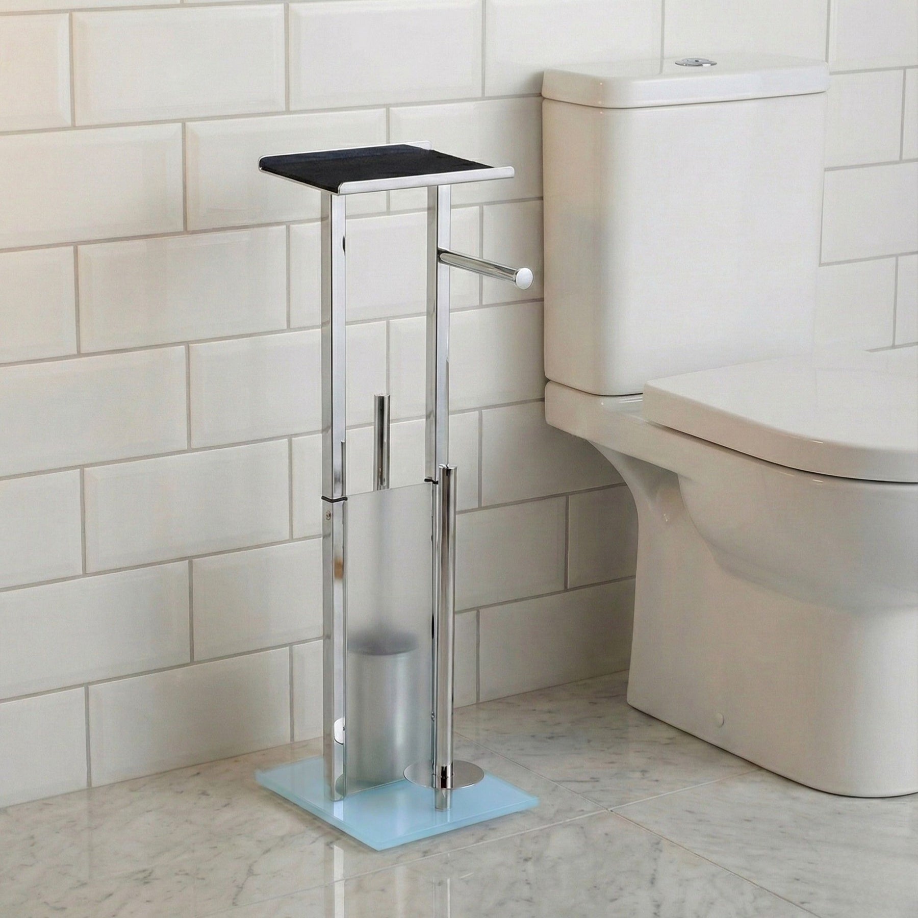 - Kompleksowe rozwiązanie 4w1: Stojak łączy w sobie aż cztery funkcje: uchwyt na rolkę papieru, pojemnik ze szczotką WC, praktyczny stojak na zapas papieru oraz półkę na drobiazgi.