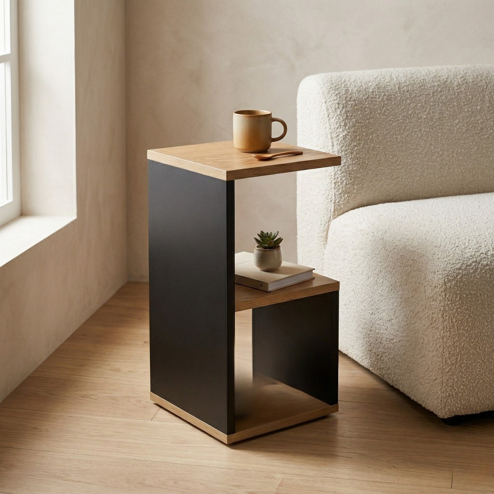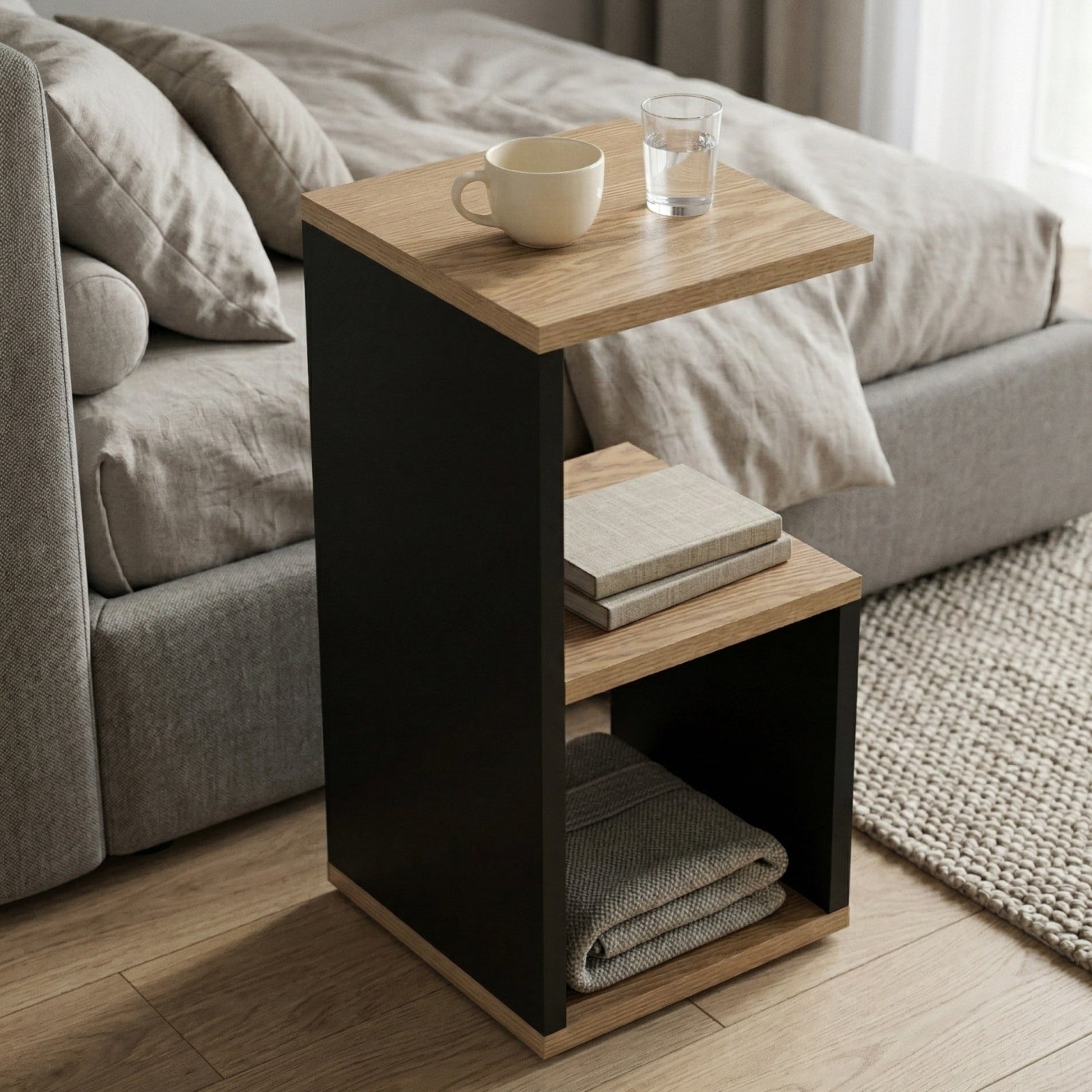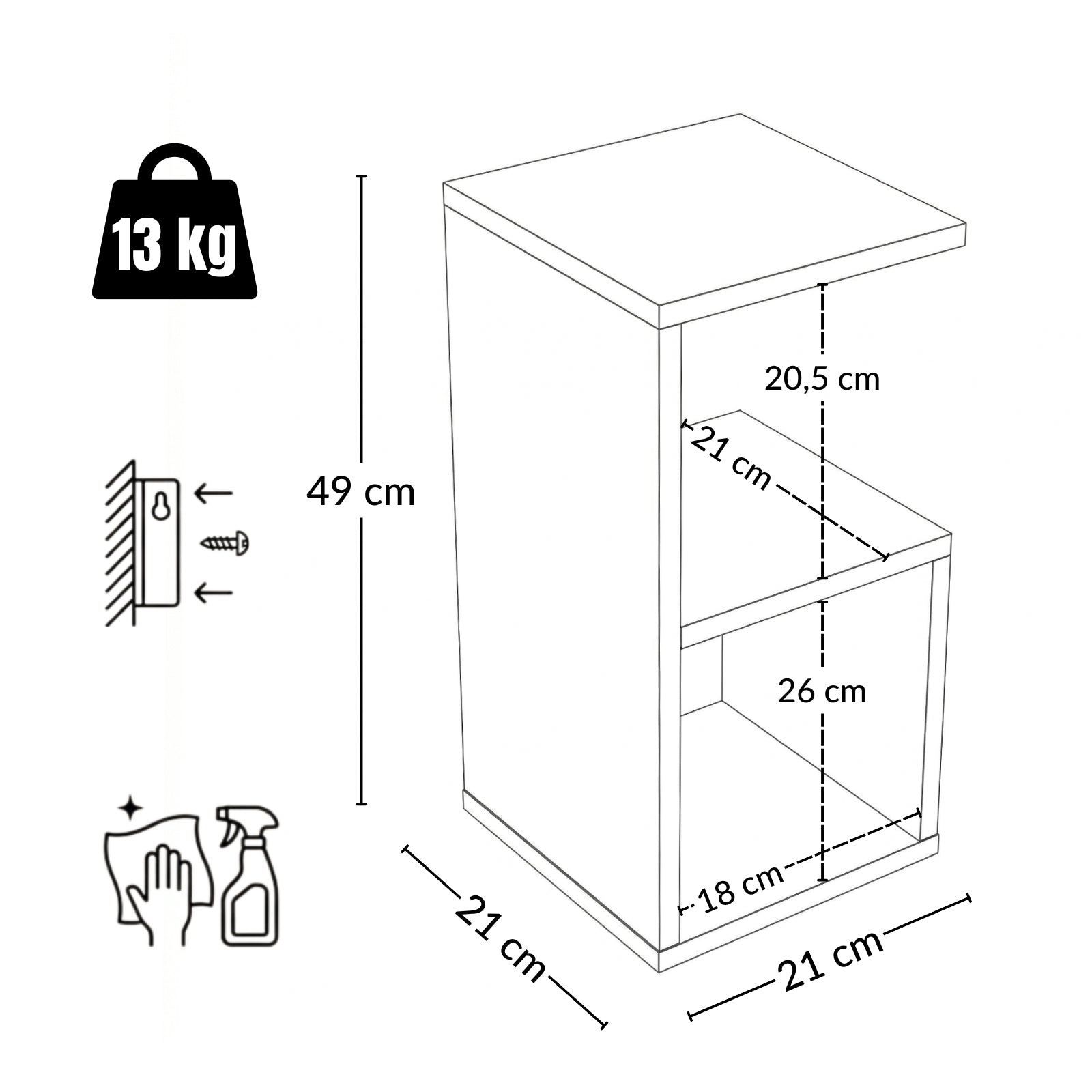 - Przemyślane wymiary półek: Stolik KODA posiada wewnętrzne półki o wymiarach 18 x 21 x 26 cm (dolna) oraz 19,5 x 21 x 20,5 cm (środkowa), co umożliwia efektywne wykorzystanie przestrzeni do przechowywania. Dzięki temu możesz z łatwością zorganizować swoje drobiazgi.
