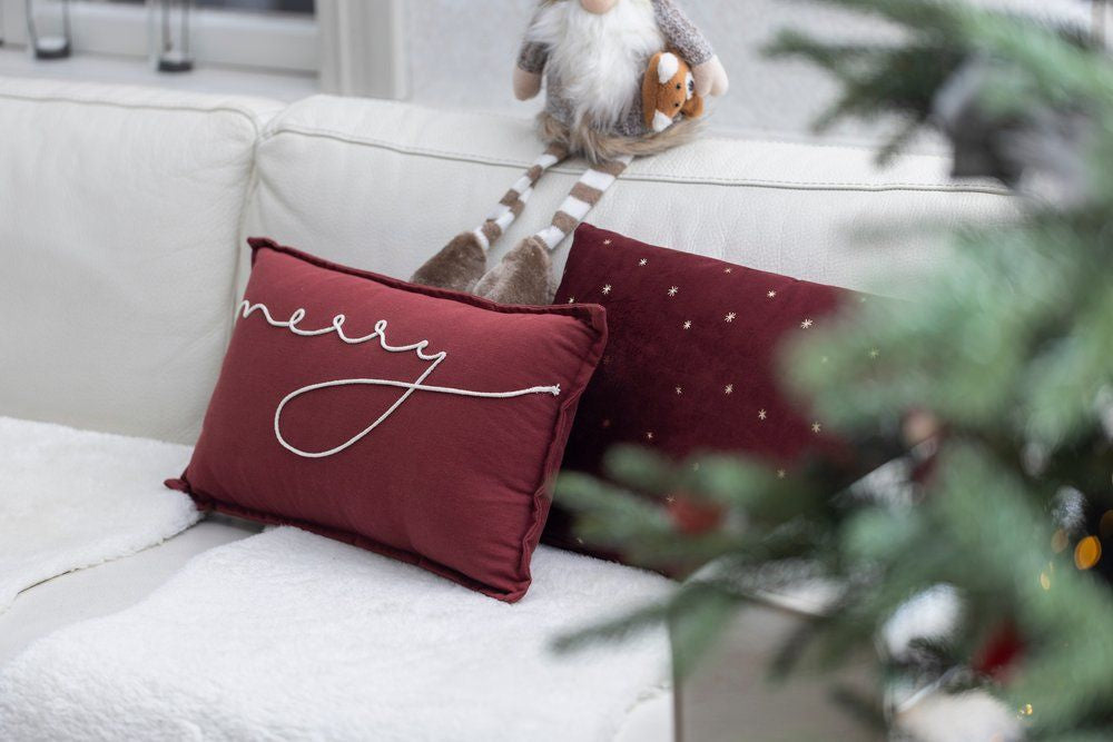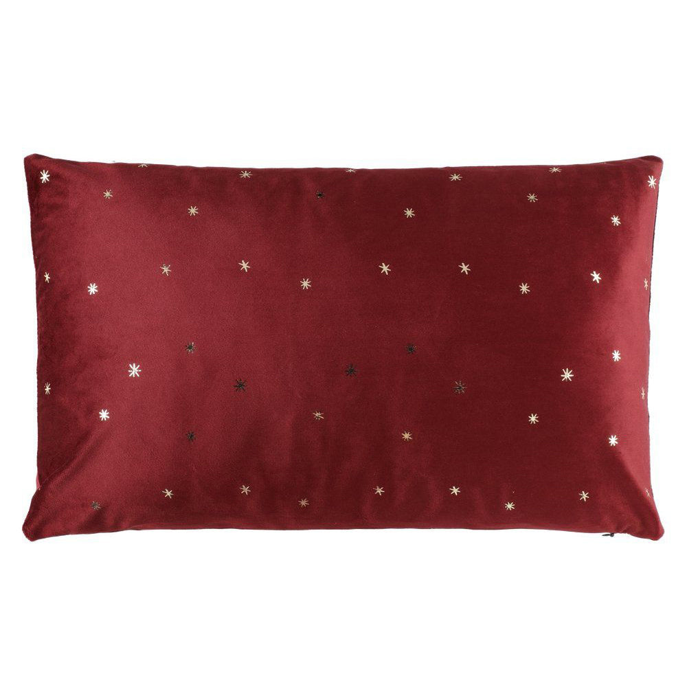 Świąteczna poduszka dekoracyjna z weluru w kolorze czerwonym z złotymi gwiazdkami - elegancki dodatek, który wprowadzi świąteczny klimat do Twojego domu