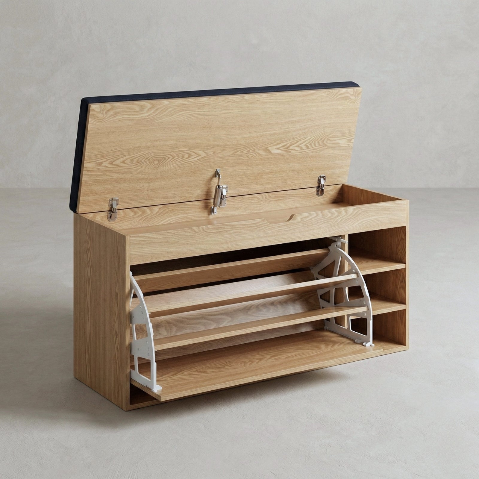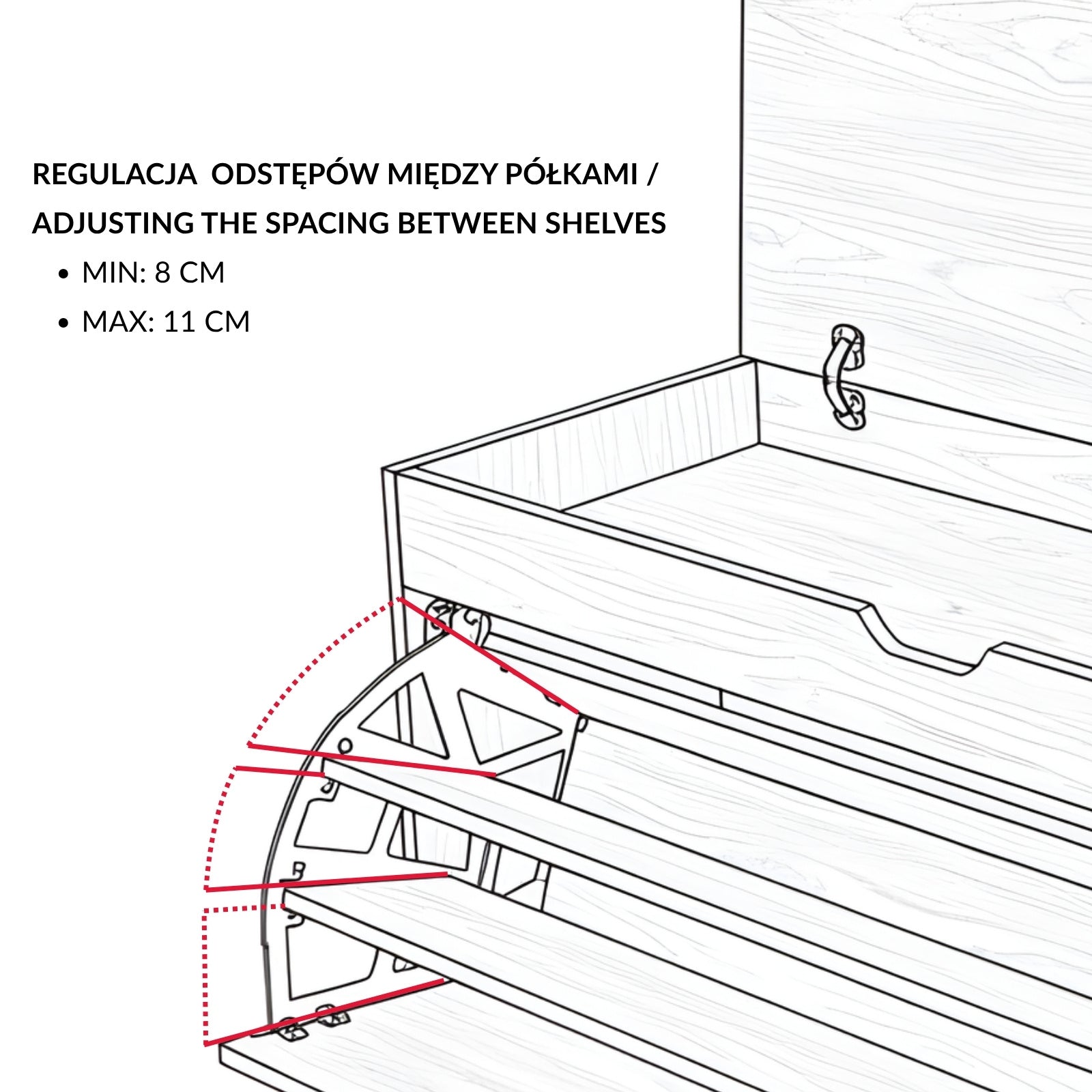 - Przemyślana konstrukcja: Trzy otwarte półki boczne umożliwiają szybki dostęp do codziennie używanego obuwia, a regulowana wysokość wysuwanych półek pozwala lepiej dopasować przestrzeń do różnych typów lekkich butów.
