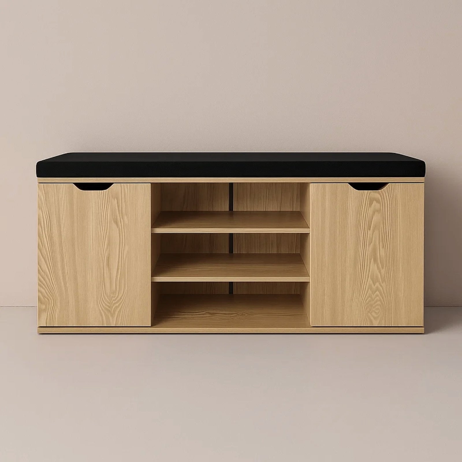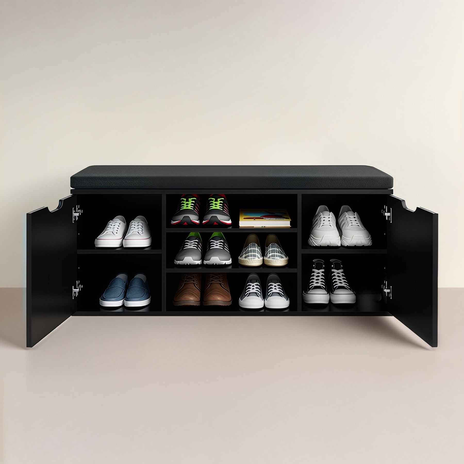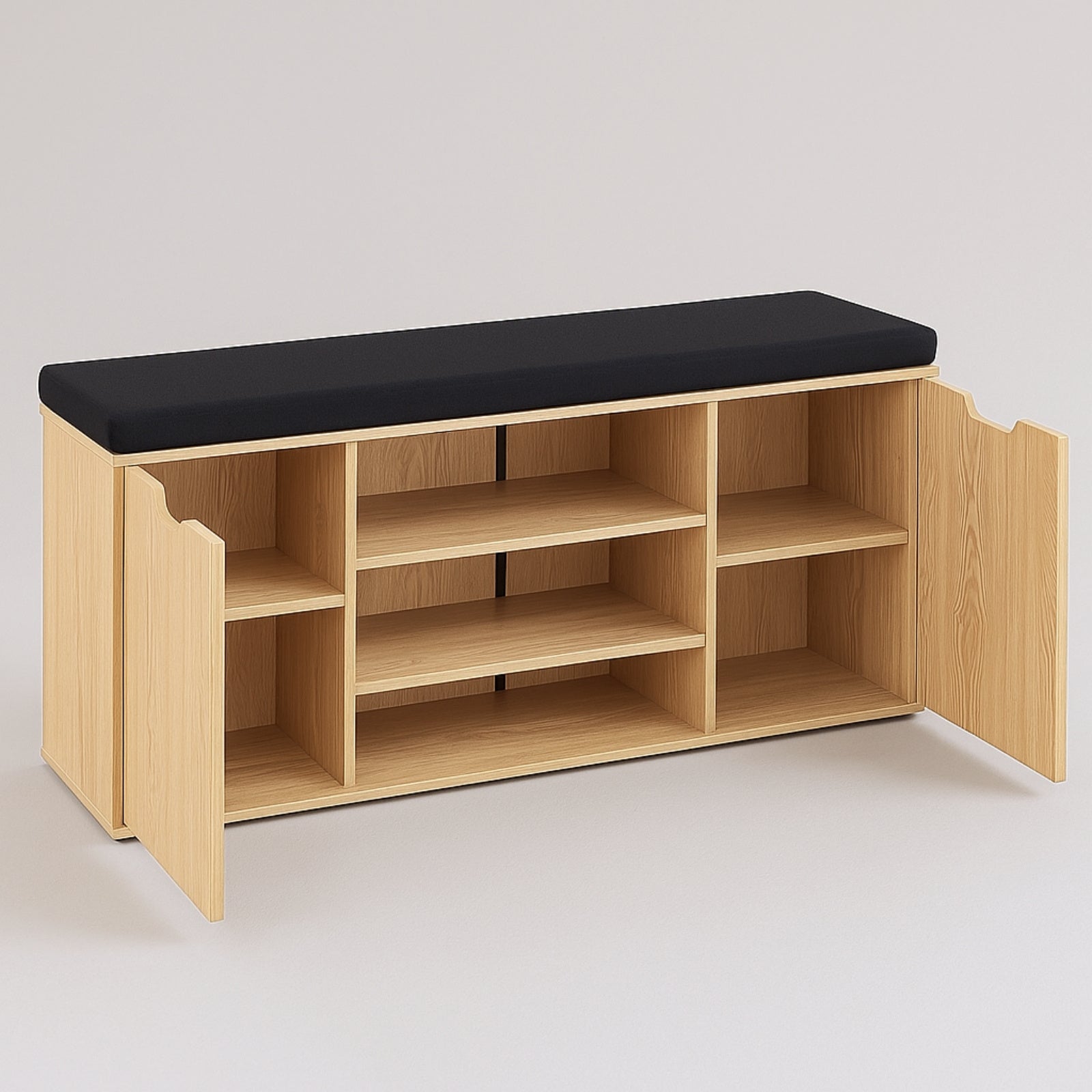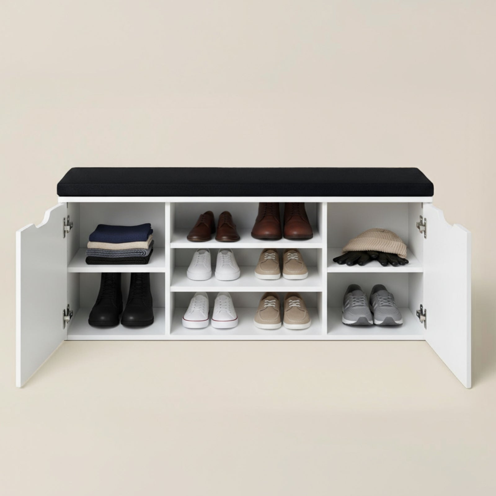 - Wielofunkcyjna konstrukcja: Otwarte półki i zamknięty schowek pomieszczą do 15 par butów, a różne wysokości półek (12–20 cm) ułatwią przechowywanie zarówno obuwia codziennego, jak i bardziej eleganckiego.